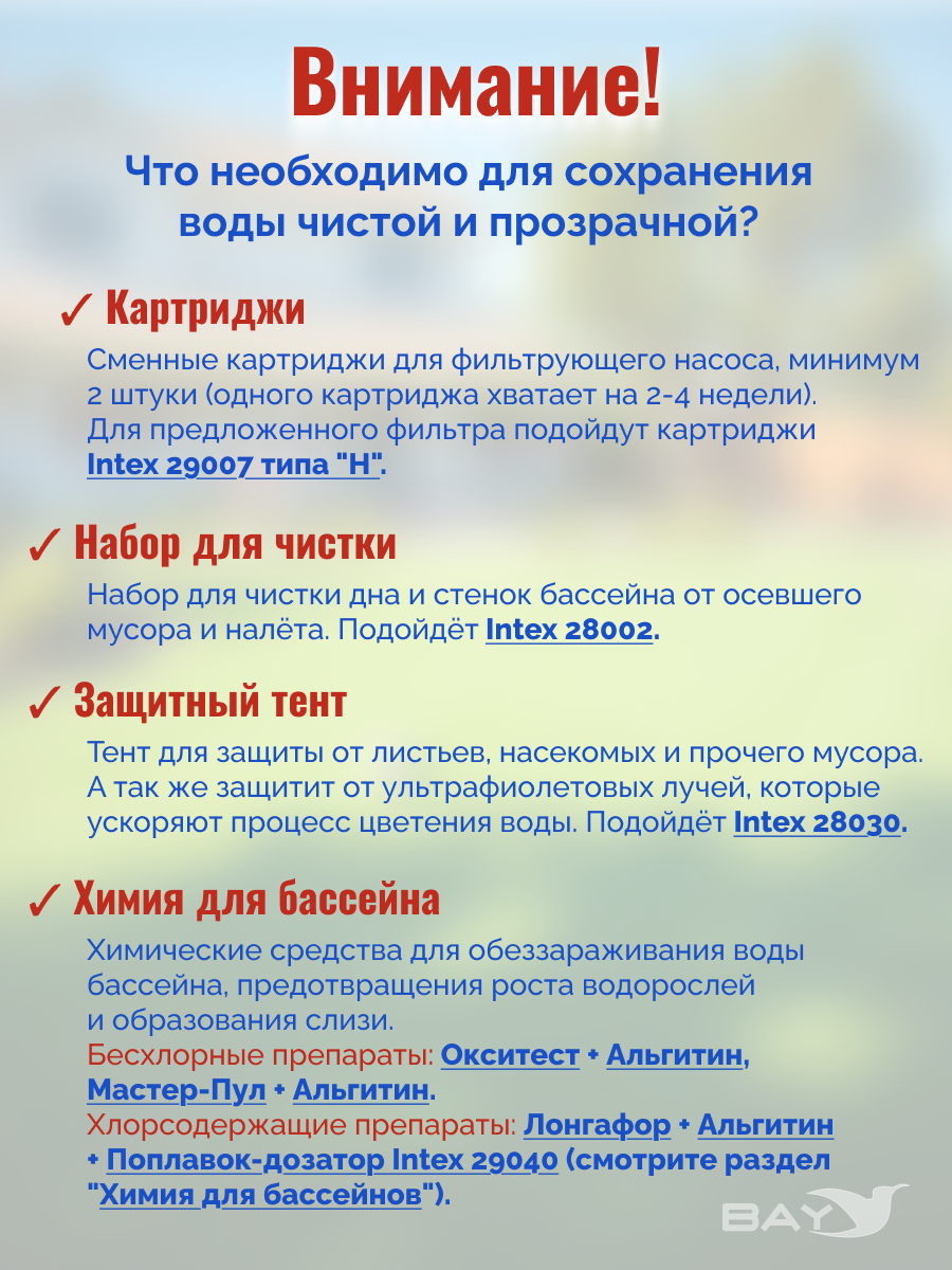 ✓ Картриджи. Сменные картриджи для фильтрующего насоса, минимум 2 штуки (одного картриджа хватает на 2-4 недели). Для предложенного фильтра подойдут картриджи Intex 29007 типа "H".