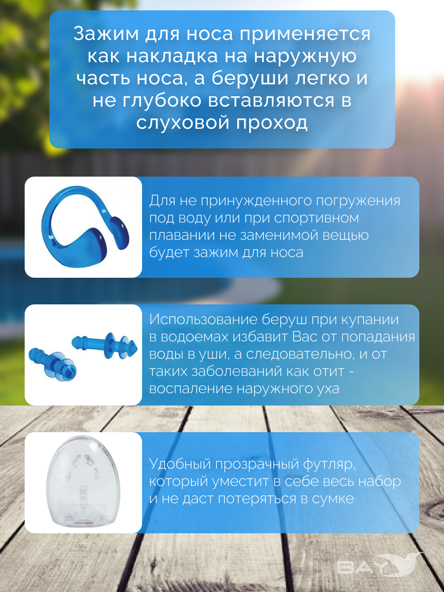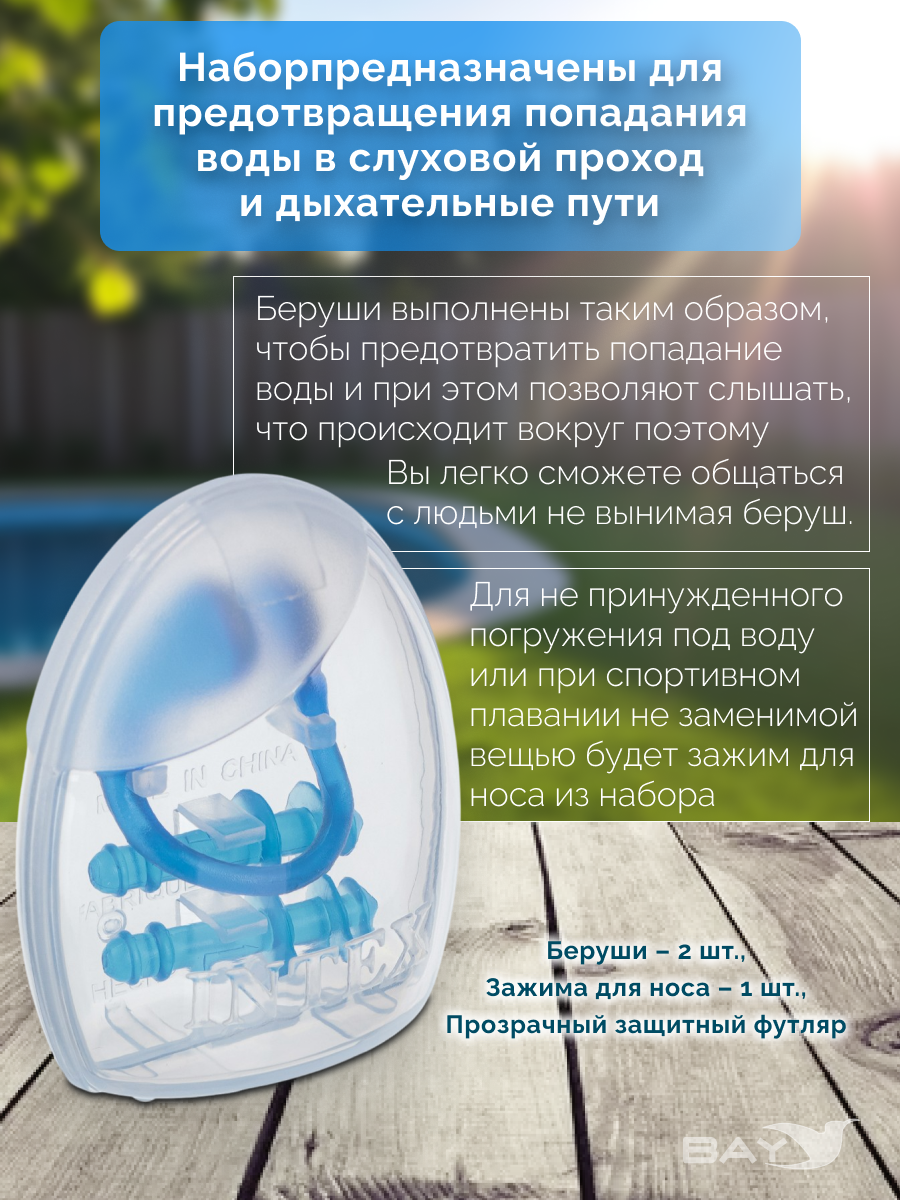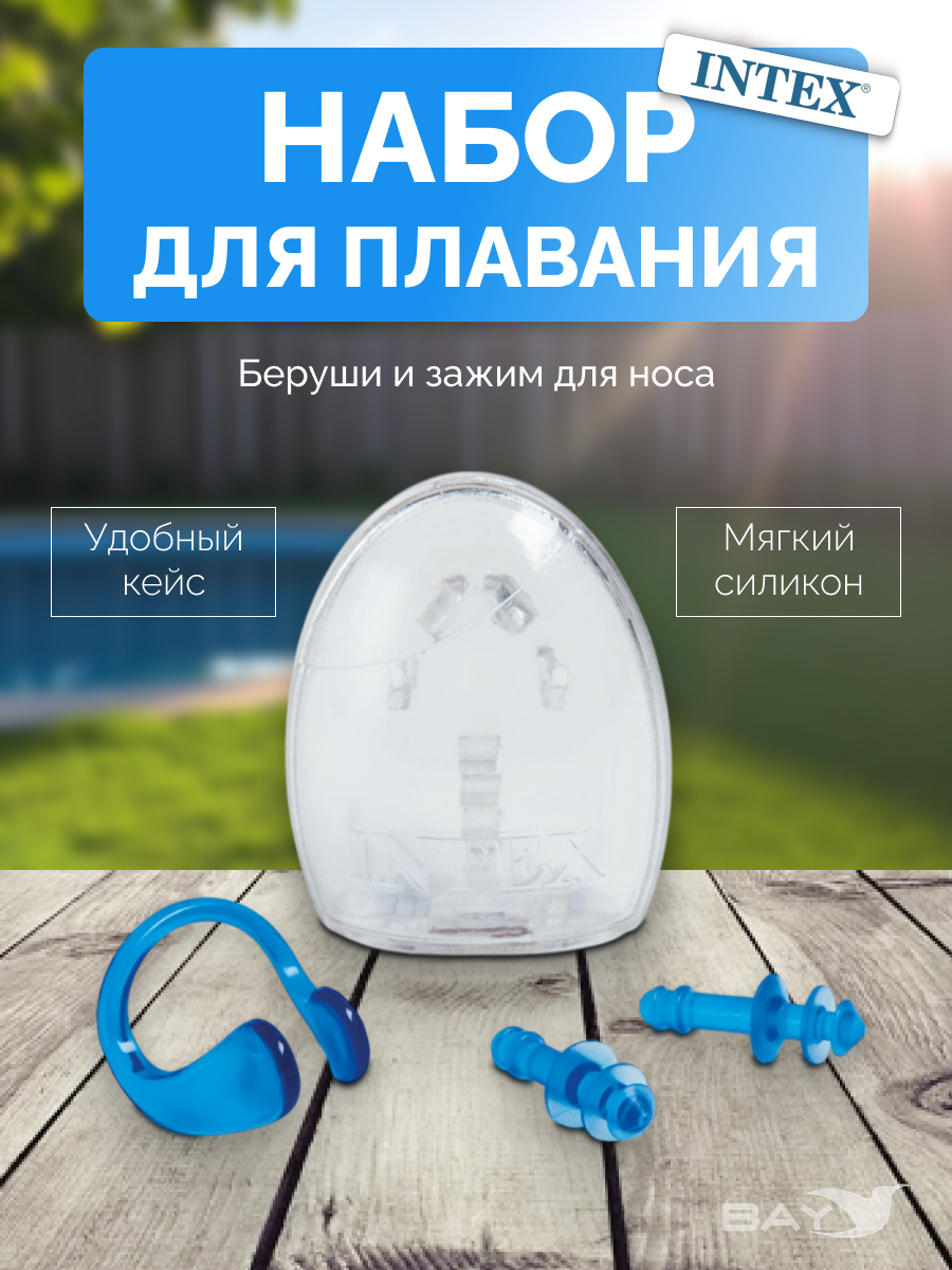 Беруши и зажим для носа Intex 55609 - просто находка для любителей бассейнов. Такой набор защитит Вас от ушных инфекций и подарит комфортное плавание. Набор включает в себя силиконовые беруши, которые плотно закроют слуховой проход и защищают Ваши уши от попадания воды. В комплекте с берушами поставляется зажим для носа - для безопасного плавания или выполнения упражнений в воде. Для удобной транспортировки и хранения предусмотрен специальный пластиковый кейс.