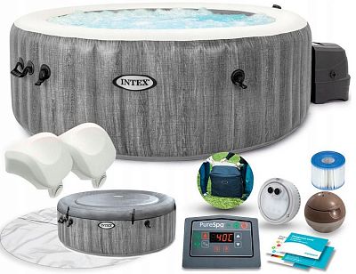 круглый джакузи (СПА) INTEX 28442 серии Greywood Deluxe с подогревом воды, 2 подголовника, LED разноцветный светильник, воздушный насос, картриджный фильтр-насос, защитный тент и сумка для хранения или переноса изделия, DVD инструкция по эксплуатации.
