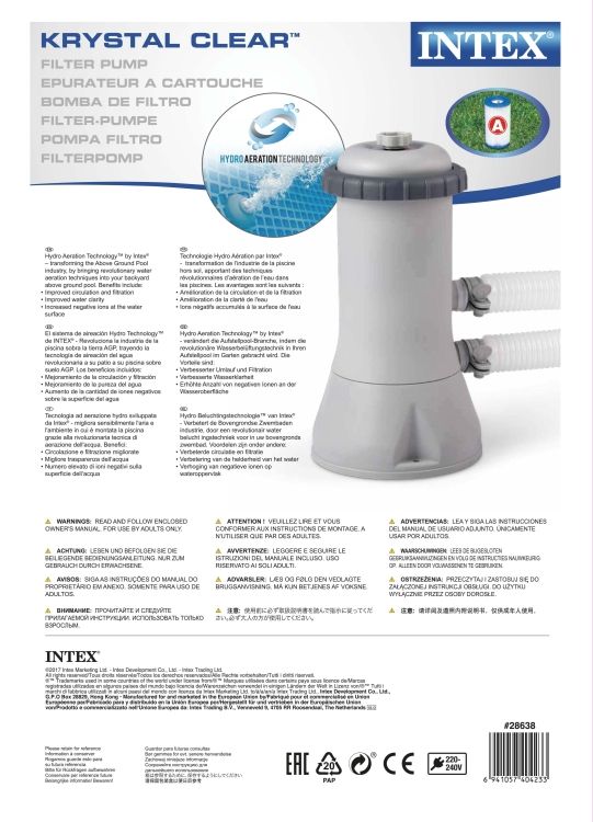 28638 Картриджный фильтр-насос 3785л/ч, картридж А, для бассейнов от 457 до 488 см Характеристики товара • Напряжение: 220-240V • Cкорость потока воды: 3785 л/ч • Тип картриджа: "A" (#29000) • Подключение: хомут, 32мм • Шланг: 32мм (#29059) Рекомендован для моделей: - Easy Set Pool: 457 см - Frame Pools: 457 см - Oval Frame Pool: 549х305 см - Ultra Frame Pool: 427 см Для каждого типа и размера марки INTEX производитель предлагает свой, оптимальный, фильтрационный насос. Специально для бассейнов диаметром 457 см предназначена модель INTEX 28638. При помощи двух гофрированных шлангов и простого подключения он обеспечивает отличное качество воды в емкости для купания. Прозрачной и чистой вода становится не только благодаря картриджному фильтру, но и новой системе гидро-аэрации. Опция представляет собой насадки, улучшающие циркуляцию воды и повышающие эффективность фильтрации.
