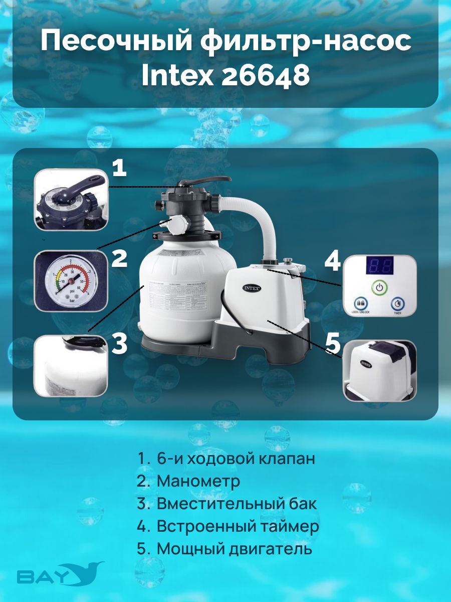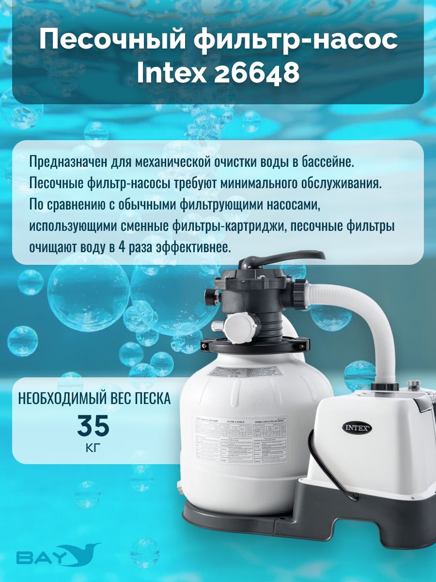 Песочный фильтр-насос Intex 26648 предназначен для механической очистки воды в бассейне. Песочные фильтр-насосы требуют минимального обслуживания. По сравнению с обычными фильтрующими насосами, использующими сменные фильтры-картриджи, песочные фильтры очищают воду в 4 раза эффективнее.