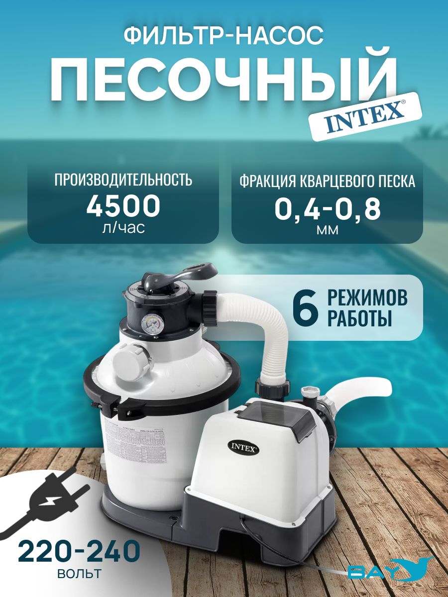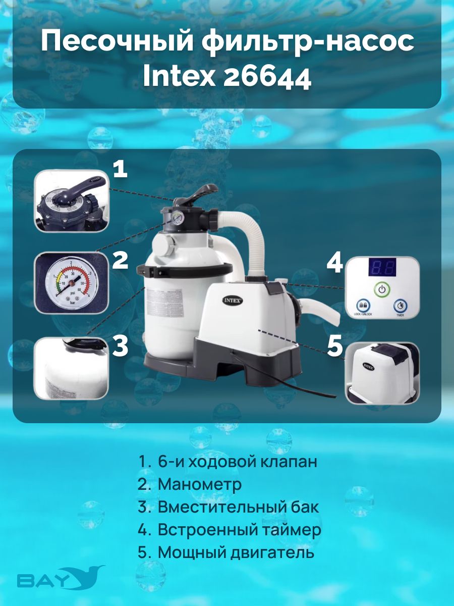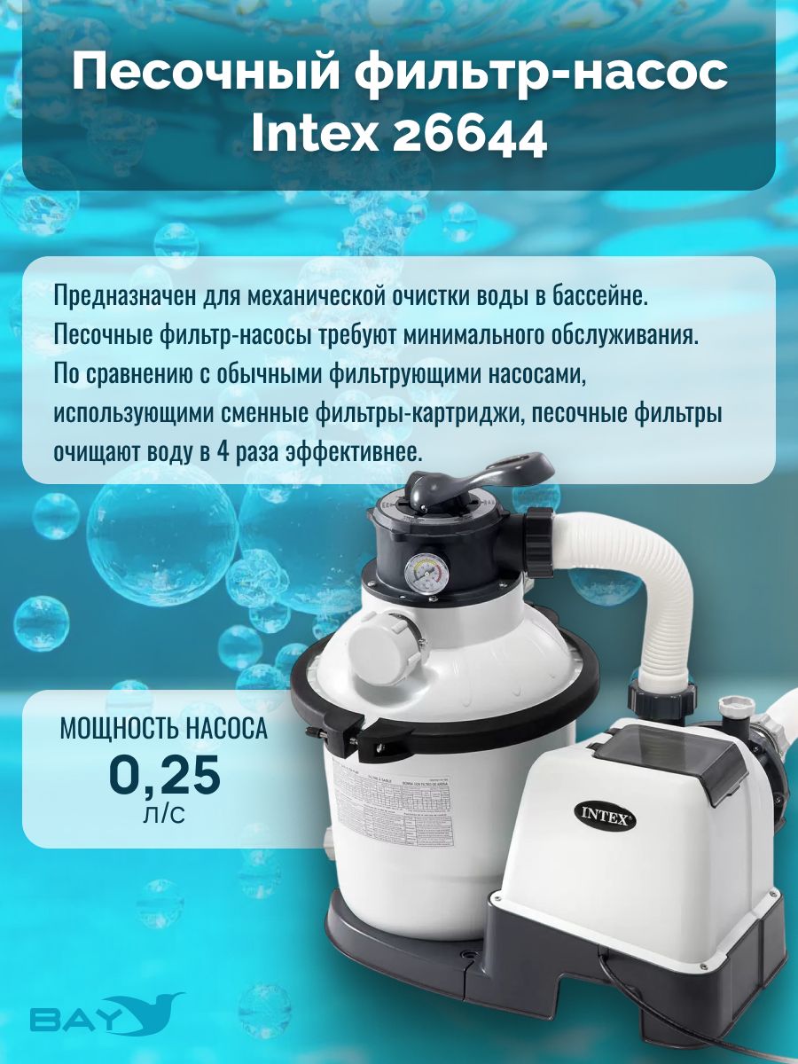 Песочный фильтр-насос Intex 26644 предназначен для механической очистки воды в бассейне. Песочные фильтр-насосы требуют минимального обслуживания. По сравнению с обычными фильтрующими насосами, использующими сменные фильтры-картриджи, песочные фильтры очищают воду в 4 раза эффективнее.