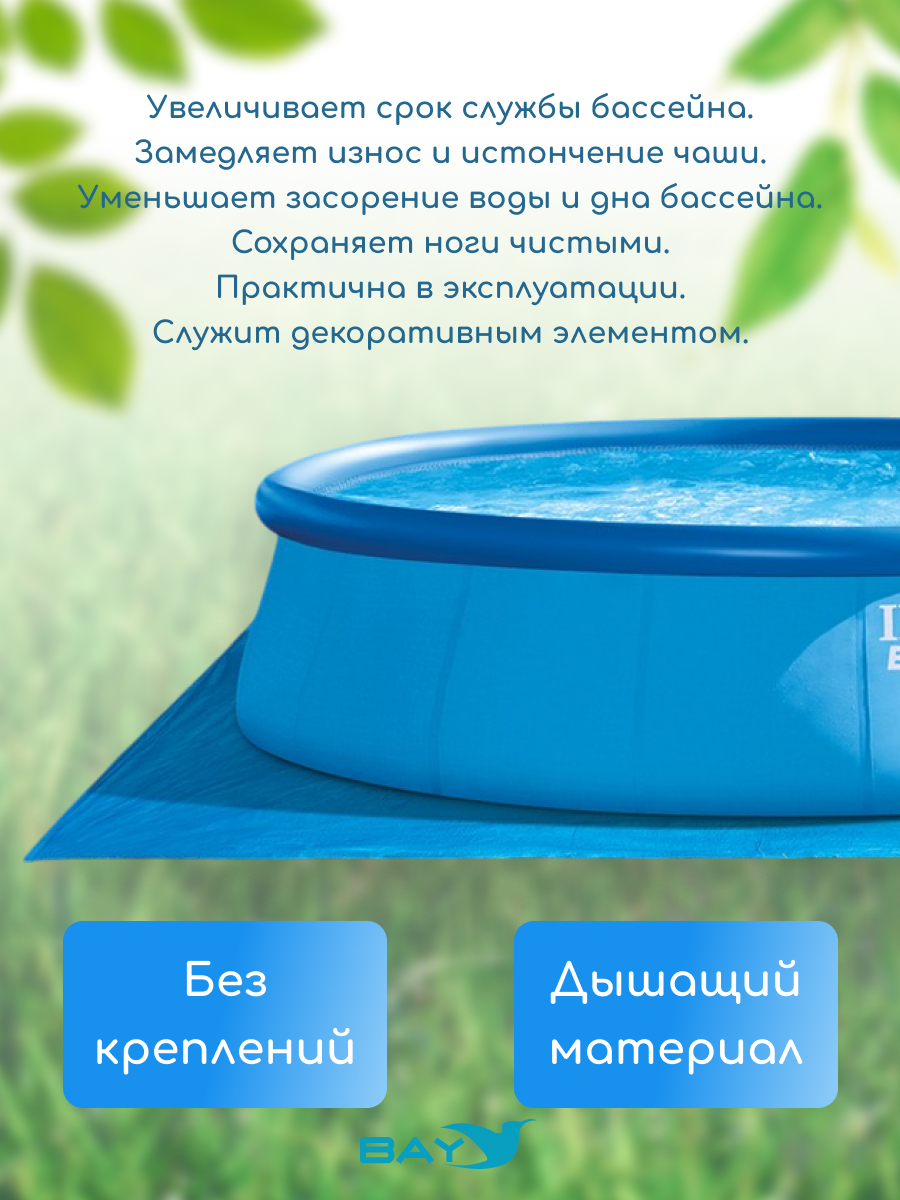 Подстилка под бассейн Intex 28048 предохраняет дно бассейна от механических повреждений и истираний. Пористый "дышащий" материал подстилки предотвратит скопление воды, а вместе с этим и запревание влаги под бассейном.