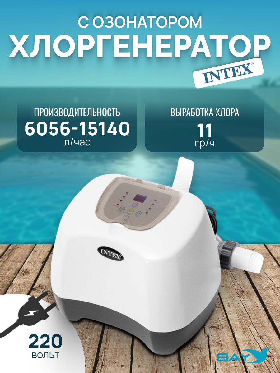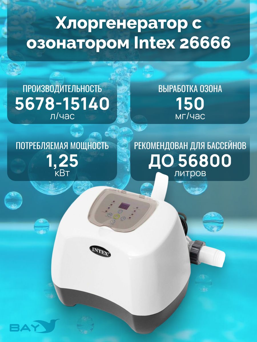 Хлорогенератор Intex 26666 – это совмещенный вариант для обеззараживания воды с двойным эффектом. Озон наиболее сильный окислитель, уничтожающий бактерии и вирусы. При озонировании, одновременно с обеззараживанием происходит обесцвечивание воды, а также ее дезодорация. Действие озона в 3.000 раз быстрее хлора. Озонатор вырабатывает озон из кислорода, содержащегося в атмосферном воздухе. Озониpование применяется как дополнительный метод дезинфекции, вместе с хлорированием. Использование хлоргенератора не только намного безопаснее для кожи и слизистой оболочки глаз, но и дешевле в эксплуатации, так как в качестве реагента используется обычная соль. Данный хлоргенератор предназначен для совместного использования с фильтрующим насосом (произв. не менее 5678 л/ч). Он имеет самоочищающуюся титановую электролитическую сетку, удобную сенсорную панель управления для задания режима работы и систему оповещения при сбоях в функционировании.