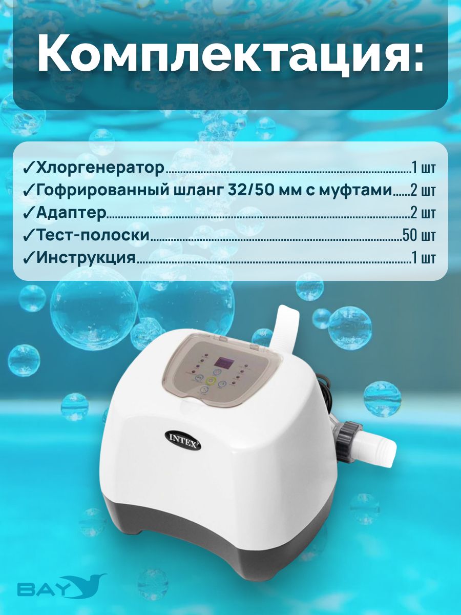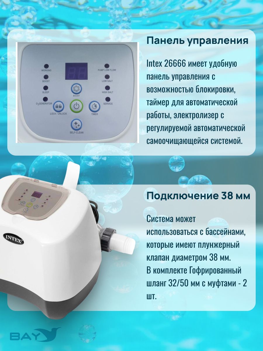 - Панель управления Intex 26666 имеет удобную панель управления с возможностью блокировки, таймер для автоматической работы, электролизер с регулируемой автоматической самоочищающейся системой.