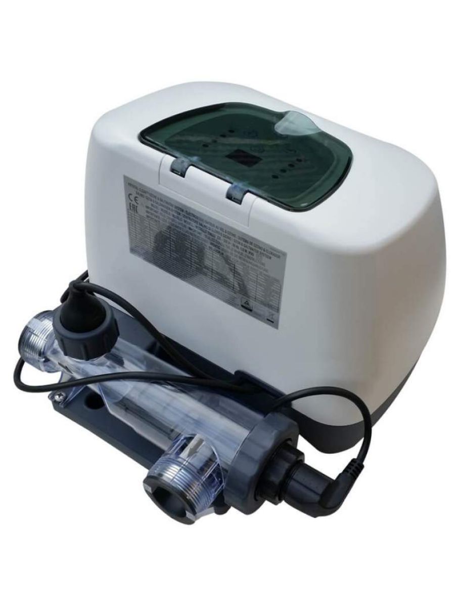 Генерация хлора - это альтернатива классическому методу хлорирования воды. Такой метод эффективнее и безопаснее, поскольку для дезинфекции используют обычную поваренную соль, которую устройство преобразует посредством электролиза в хлор. Соль высыпается в воду бассейна (необходимое кол-во соли к Вашему бассейну указано в сводной таблице инструкции хлоргенератора), размешивается фильтрующим насосом и далее включаете по инструкции систему хлорирования. Электроника системы управляет процессом обработки, показывая, в случае необходимости, пользователю коды ошибок (расшифровка таких кодов есть в инструкции на русском языке), с помощью которых определяется оптимальное количество соли в бассейне. Вода из бассейна, проходя через электролитическую камеру, обеззараживается и хлорируется.