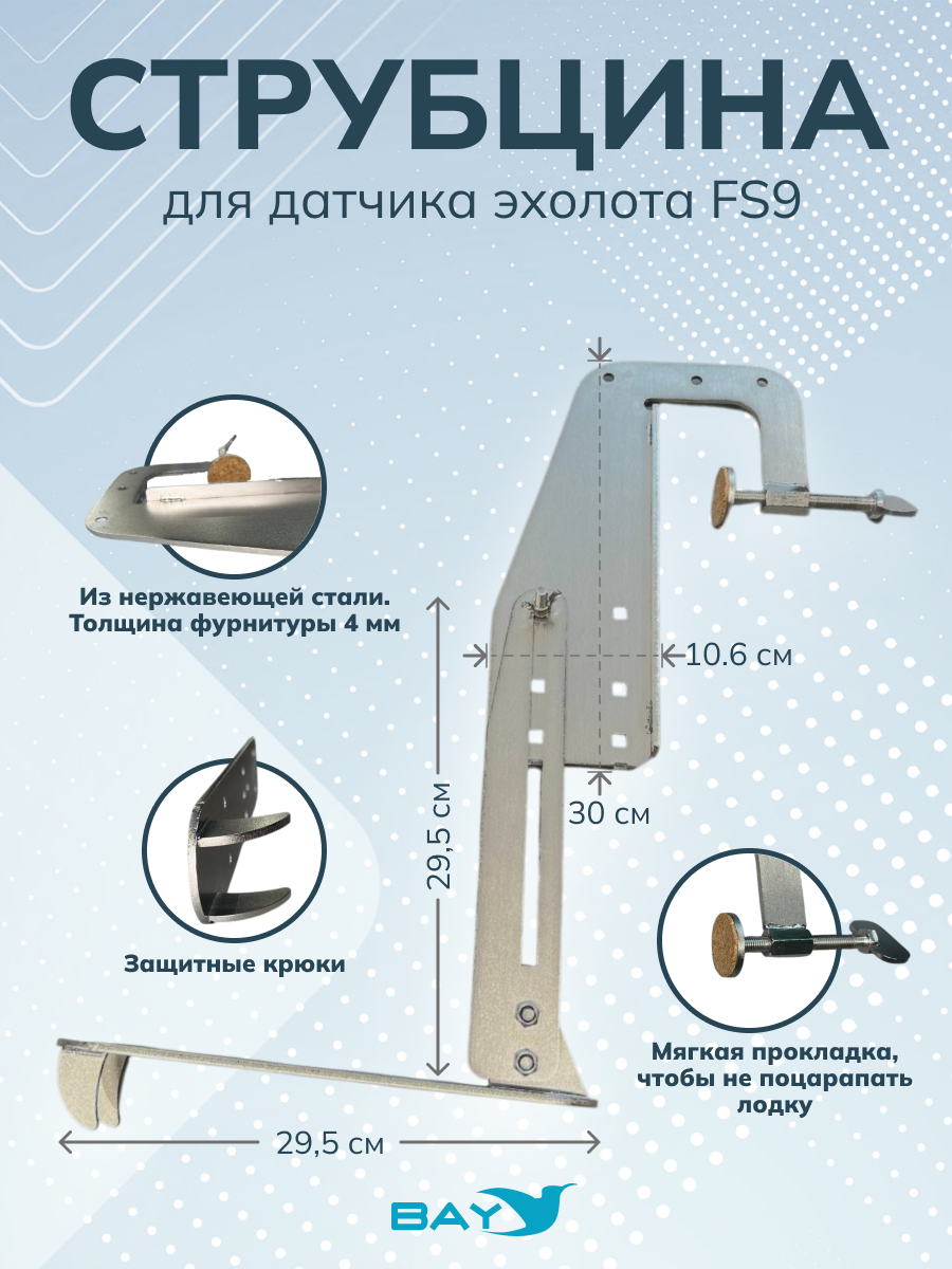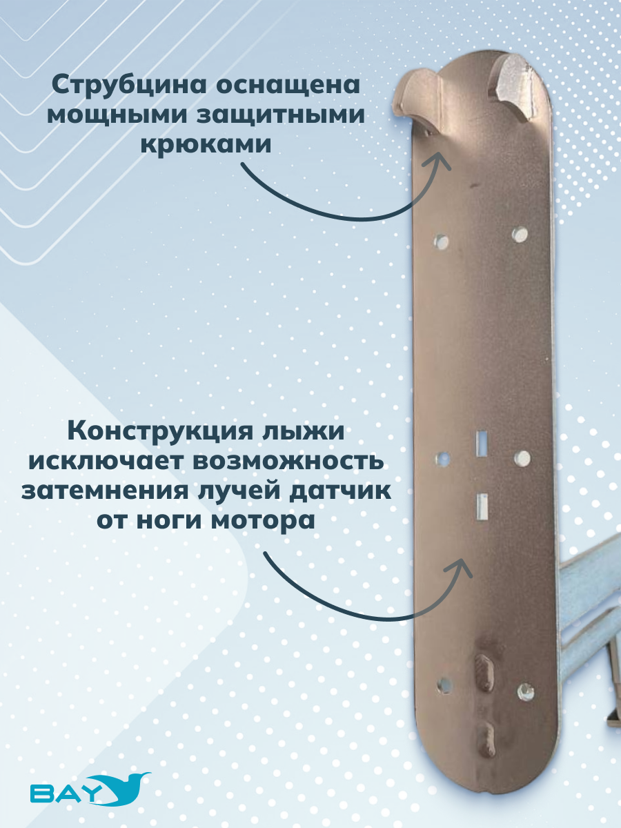 Не требует установки кармана. Конструкция лыжи исключает возможность затемнения лучей датчика от ноги мотора, и имеет защитные клыки для защиты датчика от повреждений.