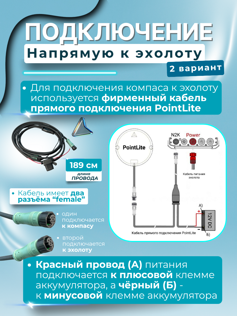 - Прямое подключение к эхолоту универсальным кабелем PointLite
