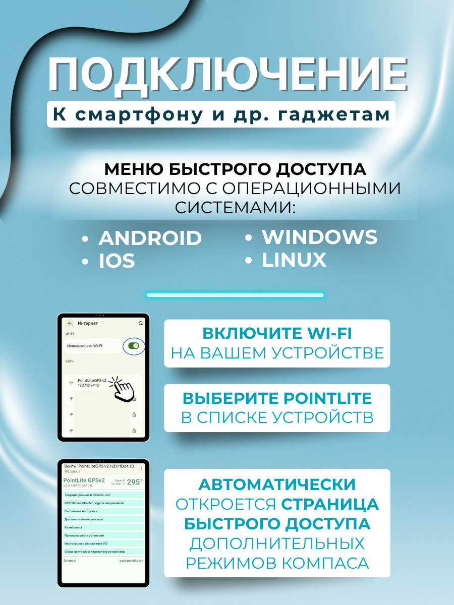 Вы можете подключить компас PointLite WiFi к планшету, компьютеру или телефону с операционной системой Linux, Windows, Android, iOS (iPhone).