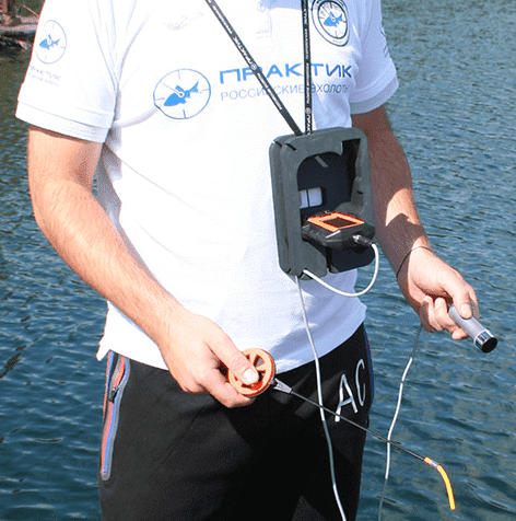 Для ловли хищника необходимо располагать Унибокс с эхолотом вертикально, чтоб экран был в зоне просмотра, а руки при этом были свободны. В данном случае Унибокс с помощью шнурка крепится на шее.
