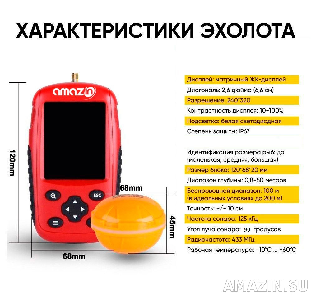Эхолот Amazin XF88W станет незаменимым инструментом для рыбаков как зимой, так и летом. Он обеспечивает исследование водоема с глубиной до 50 метров и дальностью действия до 100 метров (в идеальных условиях — до 200 м). Устройство оснащено датчиком с углом обзора 90 градусов и работает на частоте 125 кГц.