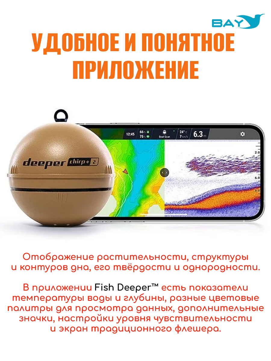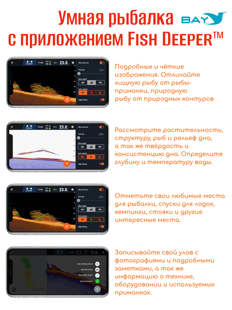 УДОБНОЕ И ПОНЯТНОЕ ПРИЛОЖЕНИЕ. Отображение растительности, структуры и контуров дна, его твердости и однородности. В приложении Fish Deeper™ есть показатели температуры воды и глубины, разные цветовые палитры для просмотра данных, дополнительные значки, настройки уровня чувствительности и экран традиционного флешера.