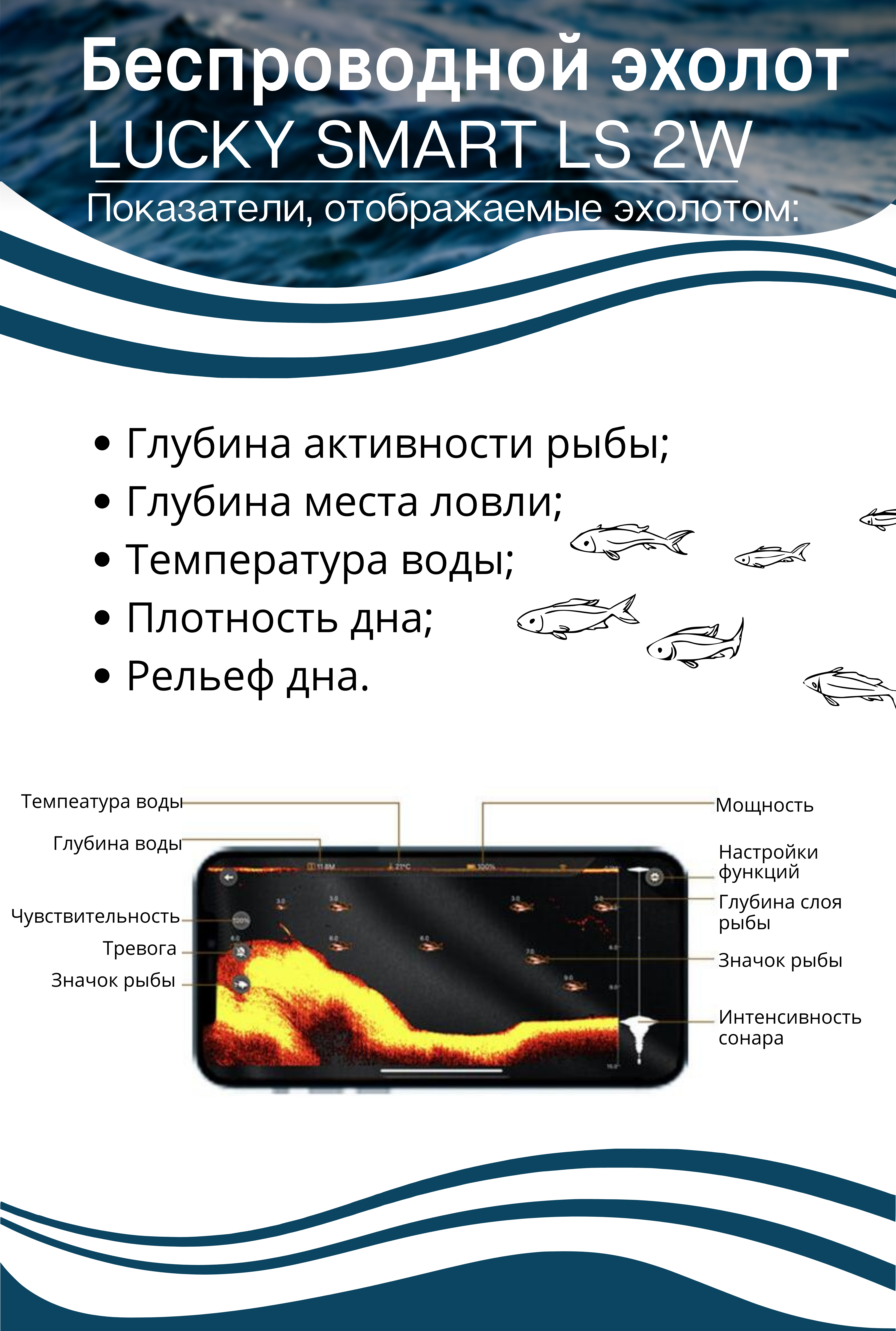 Новинка среди новой линейки беспроводных эхолотов компании Лаки Lucky smart. Модель специально разработана для использования со смартфонами, работающими на Android или IOS.