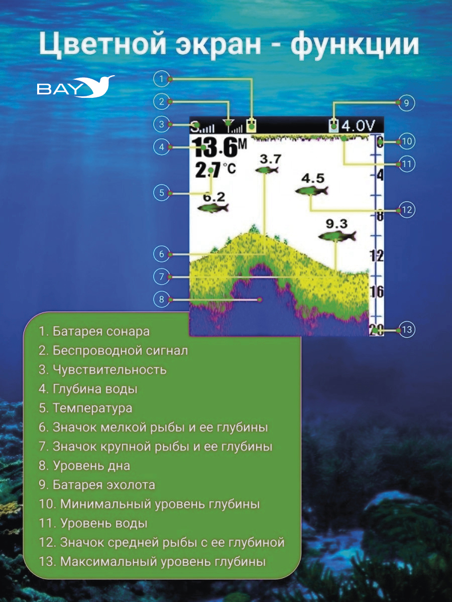 Беспроводной датчик сонара обеспечивает угол сканирования 90 градусов и глубину сканирования 45 м. Матричный дисплей предоставит всю подробную полезную подводную информацию. Этот портативный эхолот с беспроводным датчиком сонара - ваш лучший партнер.