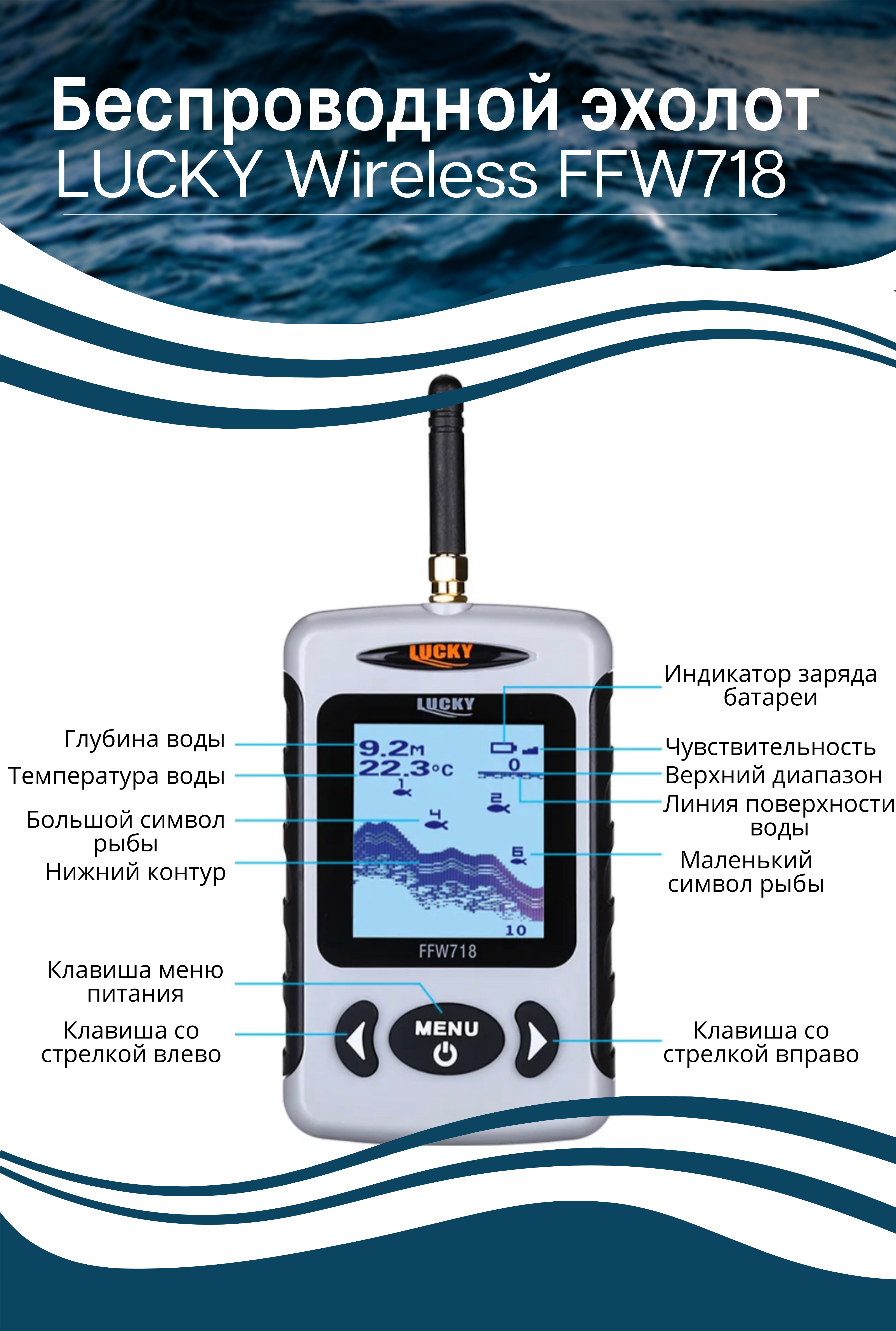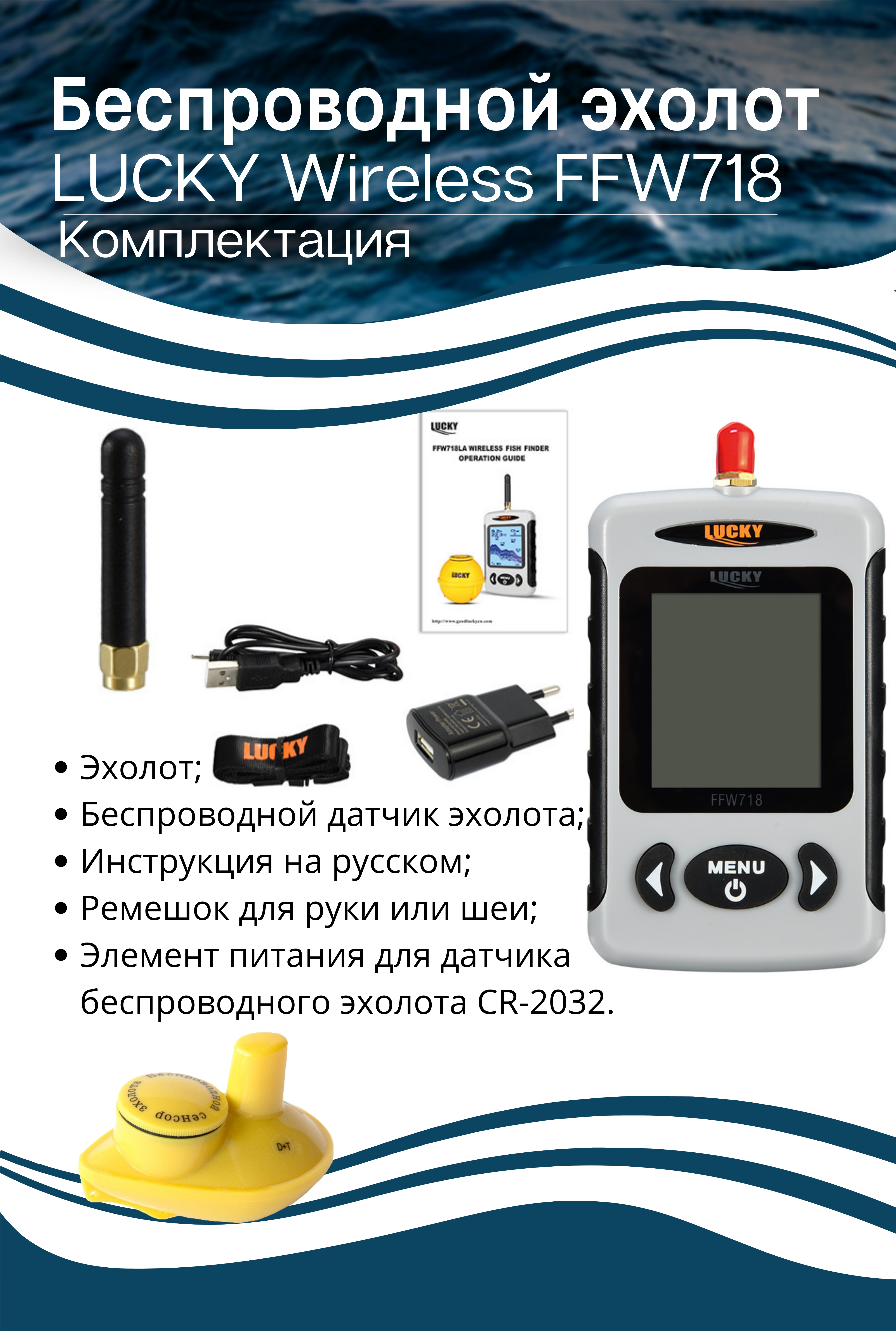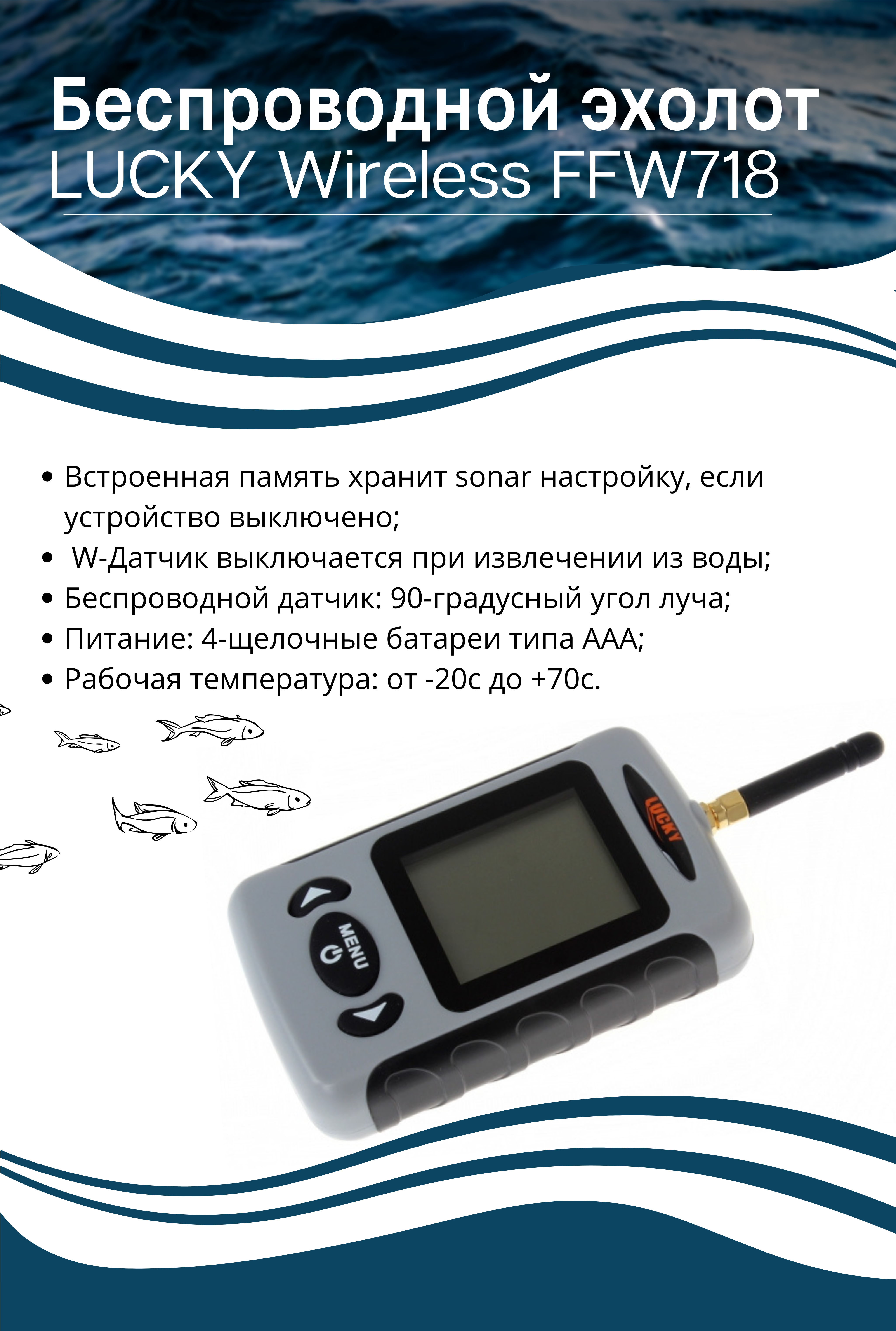 Беспроводной эхолот Lucky FFW718 отличается портативностью, компактностью и точностью. Данный прибор обнаруживает местонахождение рыб разных размеров и прорисовывает глубину и рельеф дна. Модель подходит для пресноводных рек и озер, а также морей.Эхолот FFW718 выпускается крупным латвийским брендом Lucky.