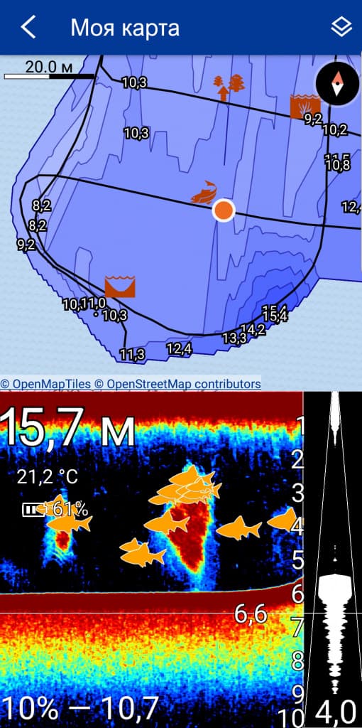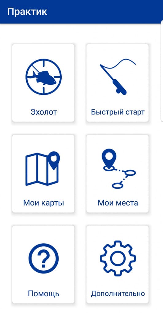 Картография (доступна при работе со смартфоном): запись карт глубин, сохранение интересных мест, построение маршрутов, редактирование записанных файлов.