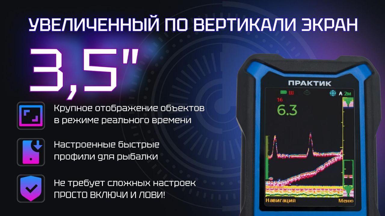 Модернизированная версия эхолота с увеличенным дисплеем для детального исследования водной толщи. Прибор предназначен для обнаружения перспективных мест ловли, поиска рыбы и наблюдения за поведением приманки. Разработан с учетом особенностей российских водоемов и климатических условий.