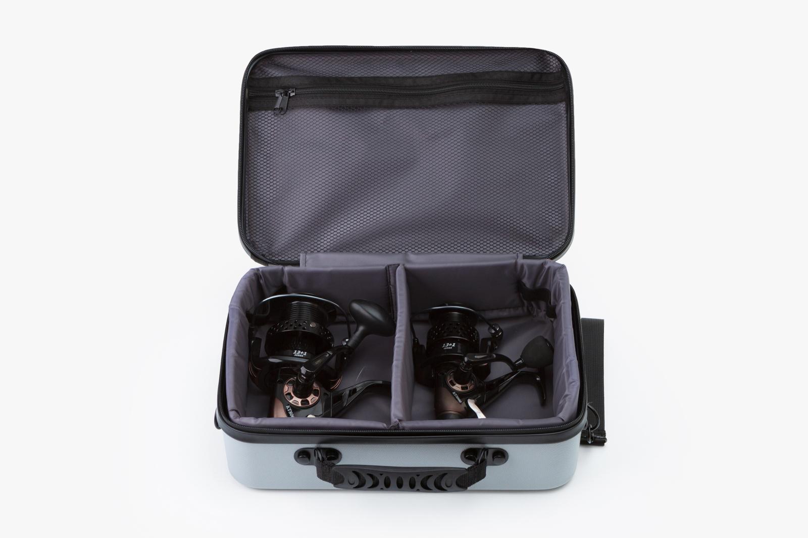 Кейс предназначен для перевозки и хранения двух спиннинговых катушек. Материал корпуса - ударопрочный пластик, внутренняя прокладка - текстиль и износостойкий поролон. Соединение двух половин корпуса происходит водостойкой прорезиненной молнией. Кейс надежно оберегает катушки от механических воздействий, не промокает, легко очищается от любой грязи. Внутри кейса съёмный вкладыш с резинкой для сменной шпули.