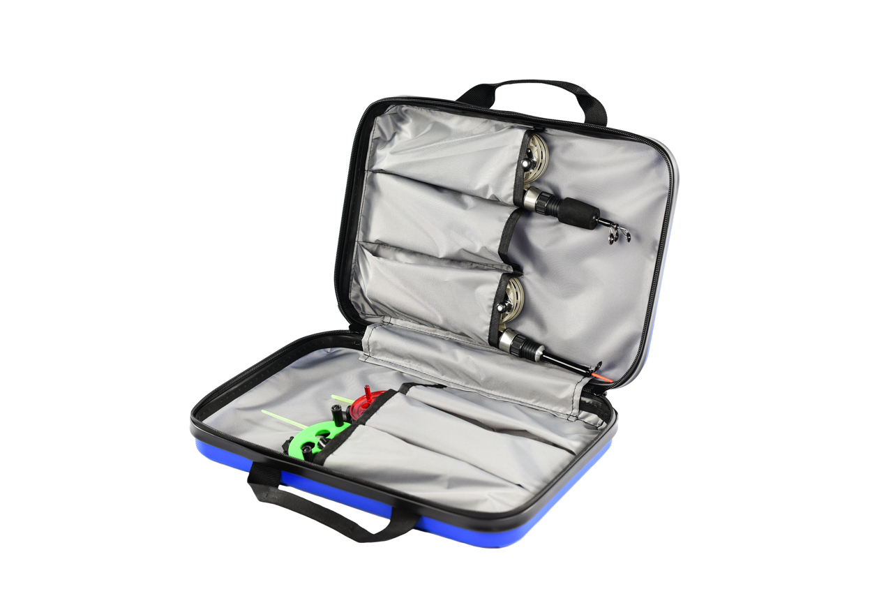 Кейс предназначен для перевозки и хранения 6-ти удилищ для зимней рыбалки. Материал корпуса - ударопрочный пластик, внутренняя прокладка - текстиль и износостойкий поролон. Соединение двух половин корпуса происходит водостойкой прорезиненной молнией.Кейс надежно оберегает удилища от механических воздействий, не промокает, легко очищается от любой грязи.Внутри кейса 6 отсеков для удилищ.