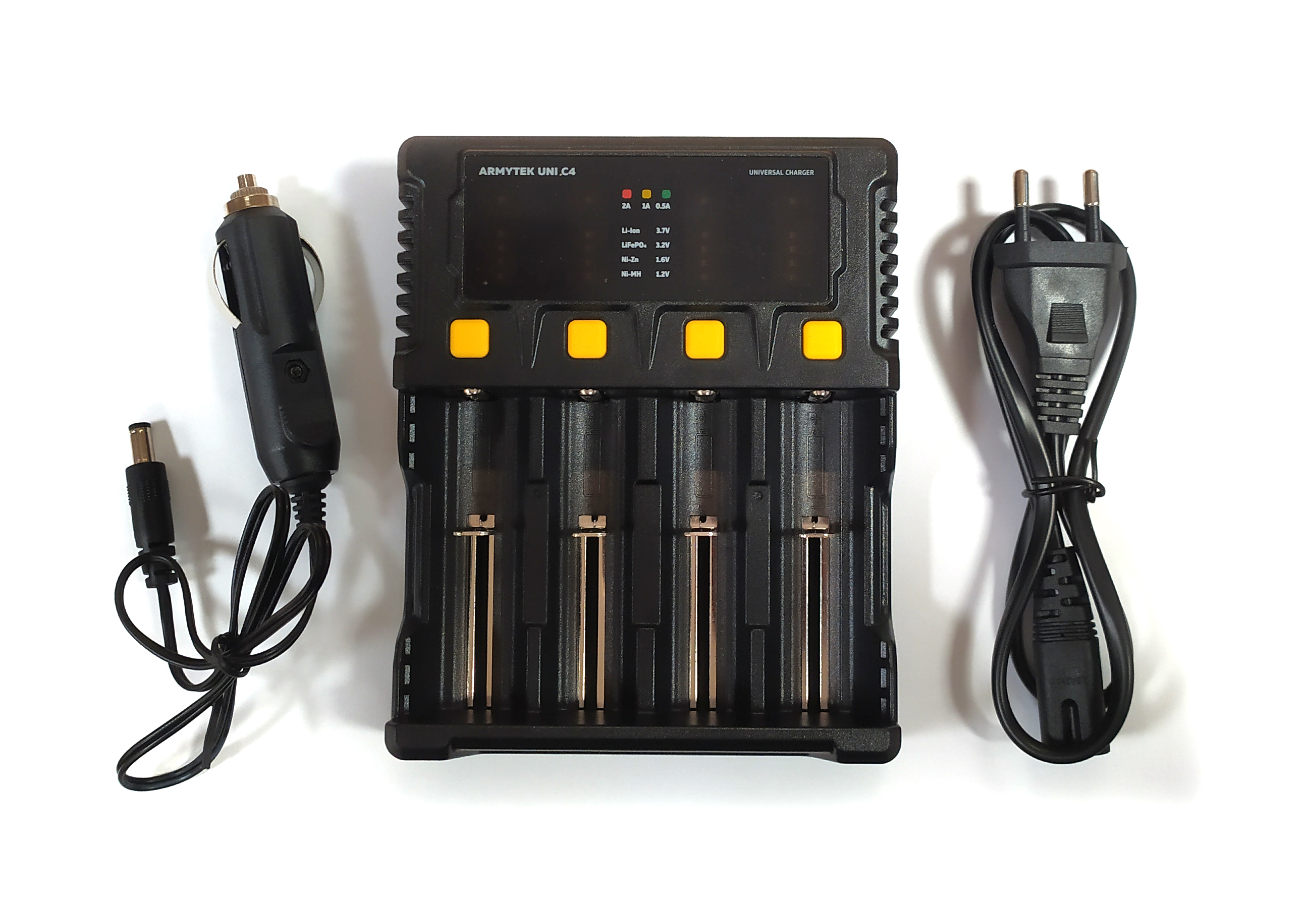 Armytek Uni C4 – универсальное зарядное устройство с поддержкой IMR, Li-Ion, Ni-MH, Ni-Cd и Li-FePO4 и Ni-Zn аккумуляторов. С помощью него Вы можете заряжать одновременно аккумуляторы разных типов, благодаря тому, что напряжение подается отдельно на каждый канал. С помощью одной кнопки Вы легко сможете выбрать тип батареи и ток заряда. Устройство автоматически запоминает последний использованный тип аккумулятора, что очень удобно для быстрого запуска при следующем включении и в случае отключения электричества. Зарядное устройство изготовлено из огнестойких материалов и предназначено для прекрасного теплоотвода. Автомобильный адаптер в комплекте для быстрой зарядки в автомобиле.