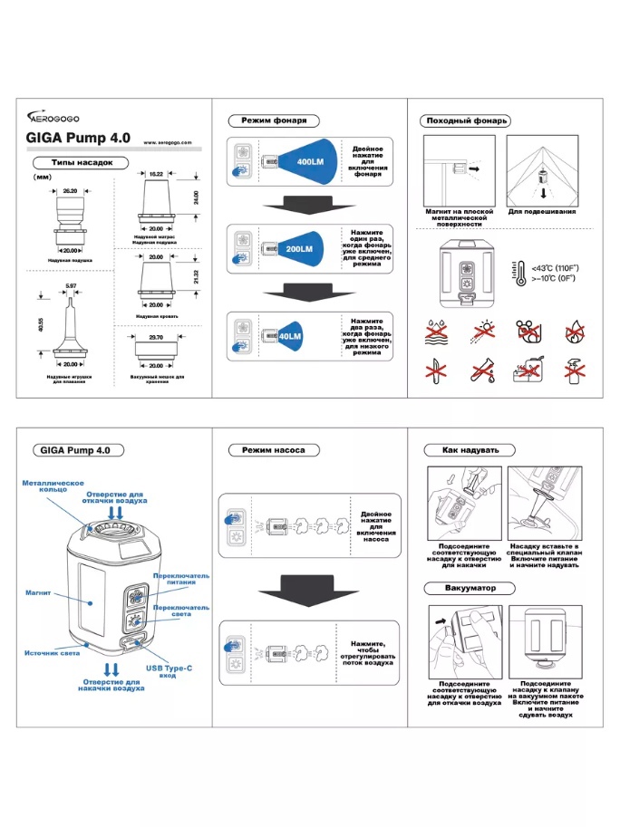 Освещение играет большую роль в создании приятной атмосферы на открытом воздухе. Кемпинговый фонарь — еще одна незаменимая функция GIGA PUMP 4.0. В нижней части фонарика на батарейках расположены восемь светодиодных лампочек. Карманный фонарик имеет 3 уровня регулировки яркости. Просто нажмите кнопку, чтобы отрегулировать яркость налобного фонарика в различных условиях в соответствии с вашими потребностями. Время освещения походного лед (LED) фонаря составляет до 10 часов.