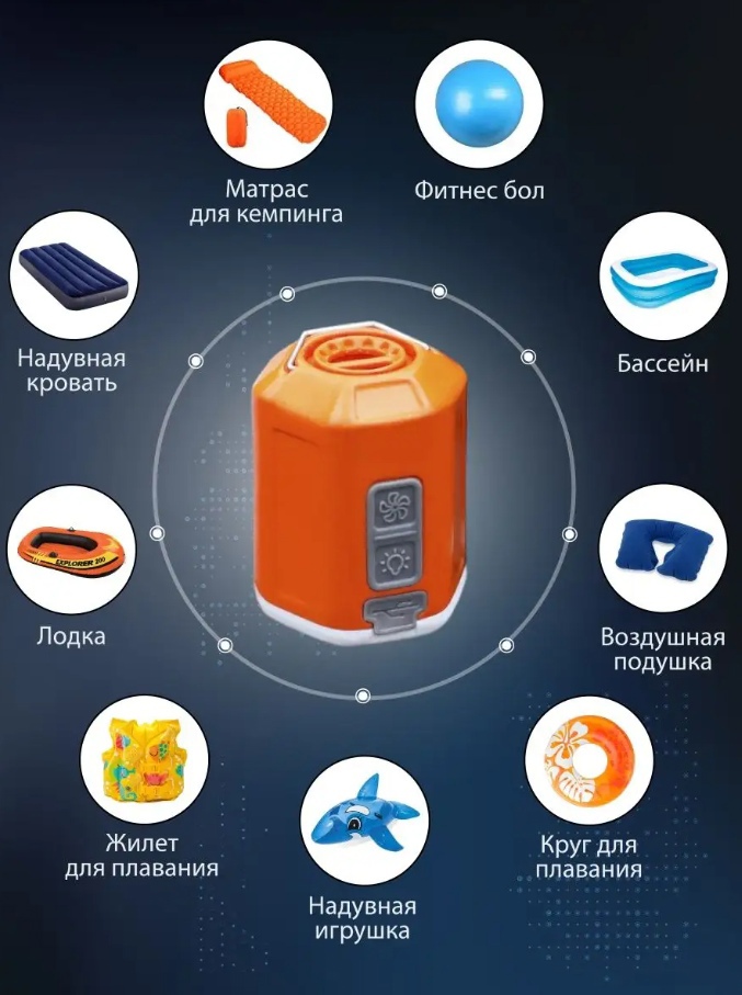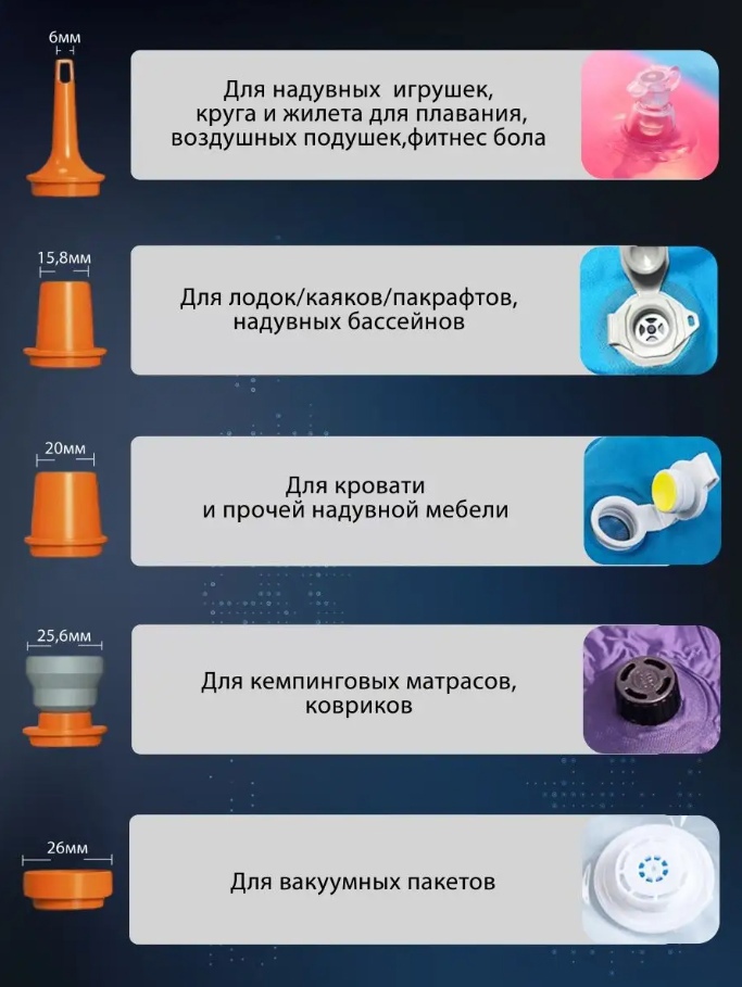 Подходит для следующих надувных изделий: матраса кровати бассейна лодки пвх фитбола (фитнес бола) надувной кровати коврика для кемпинга воздушной подушки дивана круга для плавания надувных игрушек шезлонга и прочей надувной мебели.