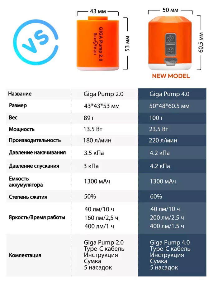 Малыш GIGA PUMP 4.0 по-прежнему продолжает концепцию компактного дизайна. Его корпус имеет размеры 50мм x 48мм x 60,5мм, а вес составляет всего 100г. Благодаря своим скромным габаритам, гаджет напоминает портативный брелок. Облегчите свое туристическое снаряжение. Уникальный дизайн внутренней конструкции электрического насоса позволяет оптимизировать воздуховод, делая беспроводной электронасос небольшим и компактным, а двигатель внутри может развивать высокую скорость до 50 000 об/мин, с потоками воздуха 220 л/мин, и давлением воздуха 4,2 кПа.