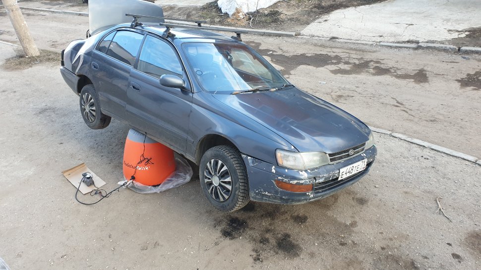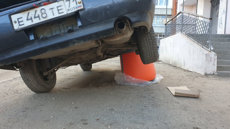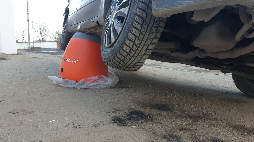 Домкрат легко помещается под днищем автомобиля даже если остался совсем маленький проем. Не нужно на коленях , засунув голову под машину искать поддомкратник - укладываете в любое место. Установив посередине можно поднять машину сразу на два колеса. Подсоединяем переходник, компрессор, заводим машину и включаем компрессор. Остается только подождать от 5 до 15 минут. Время зависит от Вашего автокомпрессора и высоты, на которую необходимо поднять машину. С помощью выхлопных газов поднять машину автомобильным надувным домкратом можно за 1-3 минуты. Накачать воздушный домкрат можно даже электрическим, ножным или ручным лодочным насосом, который способен накачивать до давления 0,8 Атм.