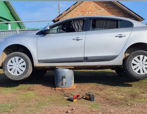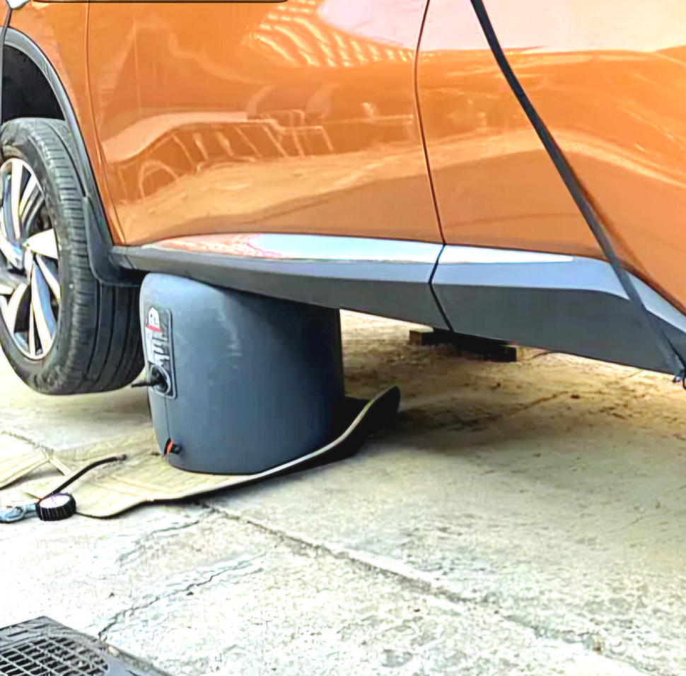 Домкрат легко помещается под днищем автомобиля даже если остался совсем маленький проем. Не нужно на коленях , засунув голову под машину искать поддомкратник - укладываете в любое место. Установив посередине можно поднять машину сразу на два колеса. Подсоединяем переходник, компрессор, заводим машину и включаем компрессор. Остается только подождать от 5 до 15 минут. Время зависит от Вашего автокомпрессора и высоты, на которую необходимо поднять машину. С помощью выхлопных газов поднять машину автомобильным надувным домкратом можно за 1-3 минуты. Накачать воздушный домкрат можно даже электрическим, ножным или ручным лодочным насосом, который способен накачивать до давления 0,8 Атм.