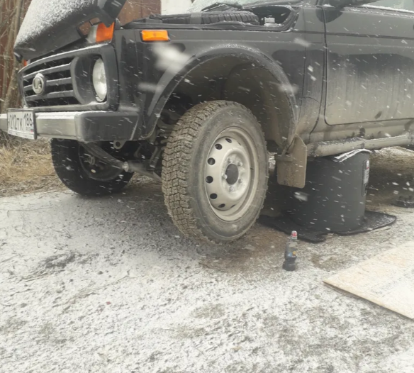 - Заглушите двигатель, поставьте на ручной тормоз, зафиксируйте передние и задние не поднимаемые колеса.