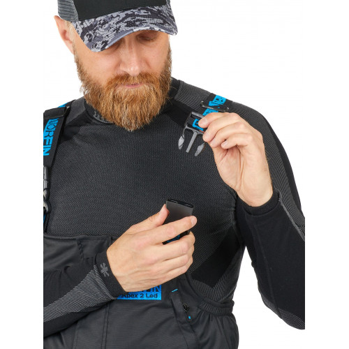 Дополнительную защиту обеспечивают проклеенные швы, дренажные отверстия для слива воды и светоотражающие элементы. Встроенная система LED SYSTEM (аккумулятор не входит в комплект) с 8 светодиодами облегчает рыбалку в темное время суток, освещая пространство и руки, а также повышает видимость для других.