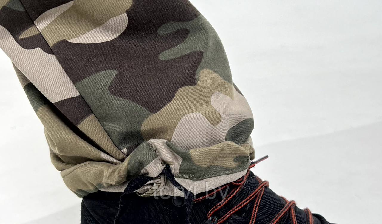 Шнурок-утяжка по низу брюк, что позволяет носить брюки поверх, так и внутрь обуви.