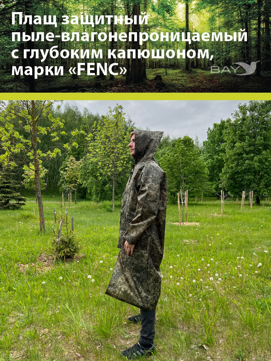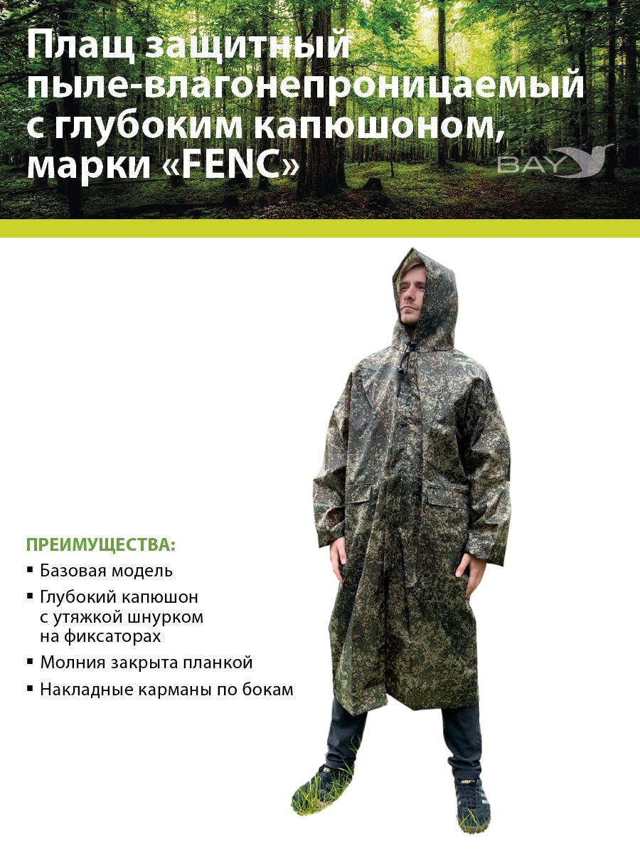 Плащ защитный, пыле-влагонепроницаемый с глубоким капюшоном, марки "FENC". Базовая модель. Глубокий капюшон с утяжкой шнурком на фиксаторах, с молнией, закрытой планкой, с накладными карманами на линии пояса по бокам.