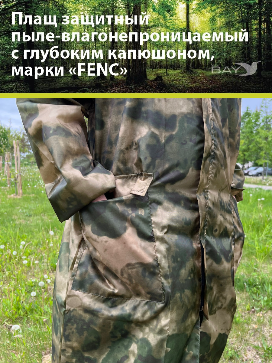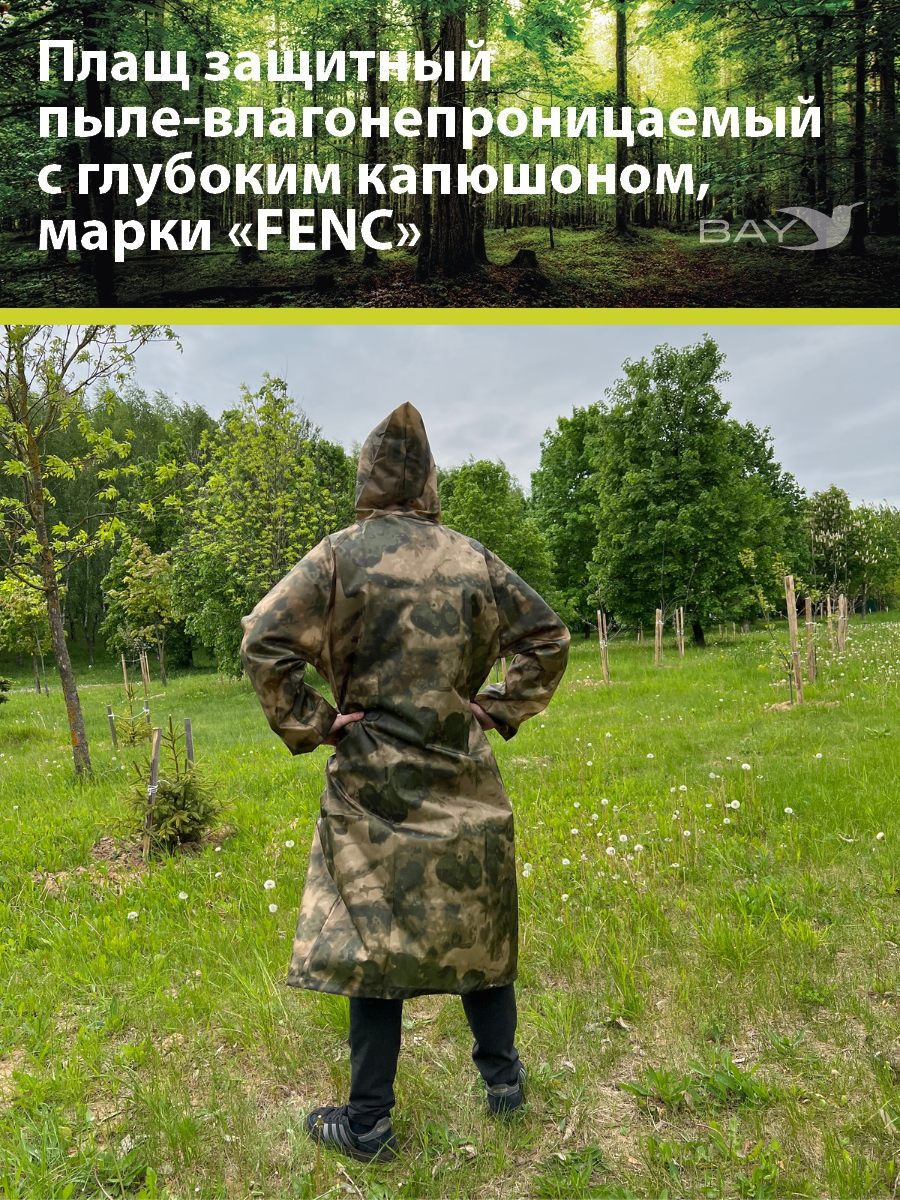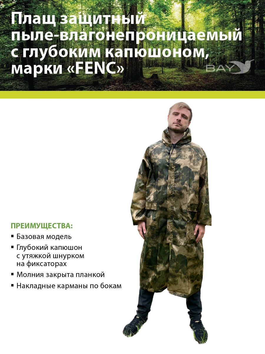 Плащ защитный, пыле-влагонепроницаемый с глубоким капюшоном, марки "FENC". Базовая модель. Глубокий капюшон с утяжкой шнурком на фиксаторах, с молнией, закрытой планкой, с накладными карманами на линии пояса по бокам. Возможно дооснащение дополнительными карманами на груди, защитные клапаны над карманами, установка кнопок на планке и клапанах, проклейка (герметизация) швов. Свободный крой.