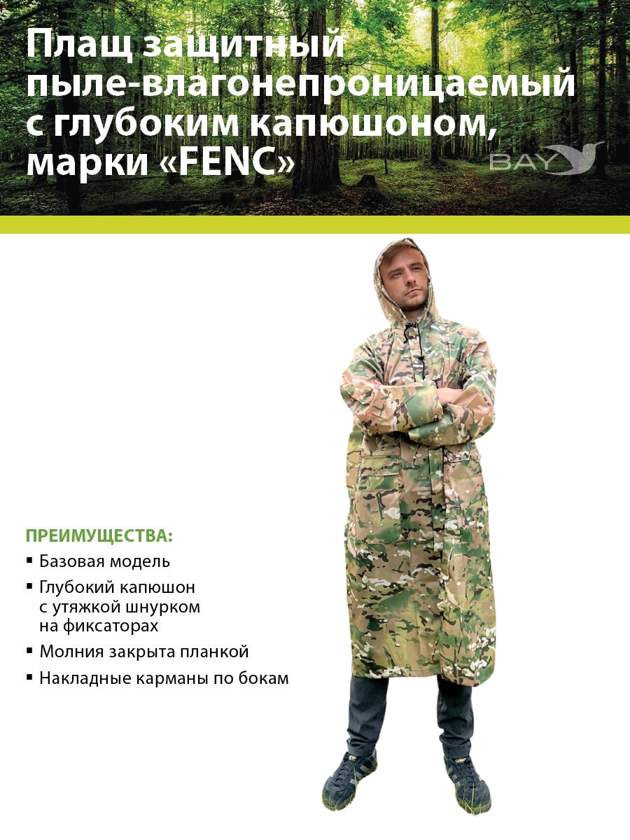 Плащ защитный, пыле-влагонепроницаемый с глубоким капюшоном, марки "FENC". Базовая модель. Глубокий капюшон с утяжкой шнурком на фиксаторах, с молнией, закрытой планкой, с накладными карманами на линии пояса по бокам. Возможно дооснащение дополнительными карманами на груди, защитные клапаны над карманами, установка кнопок на планке и клапанах, проклейка (герметизация) швов. Свободный крой. Продукция собственного производства.