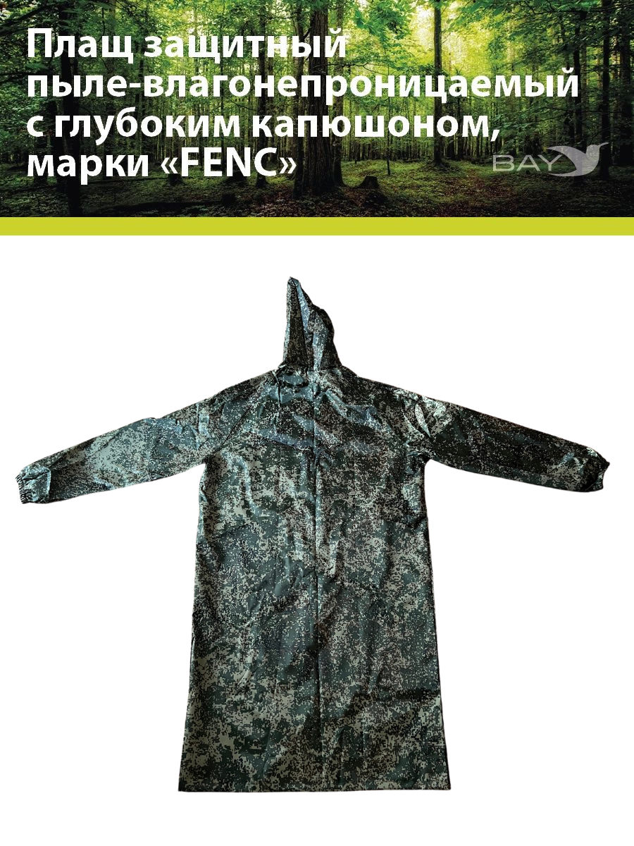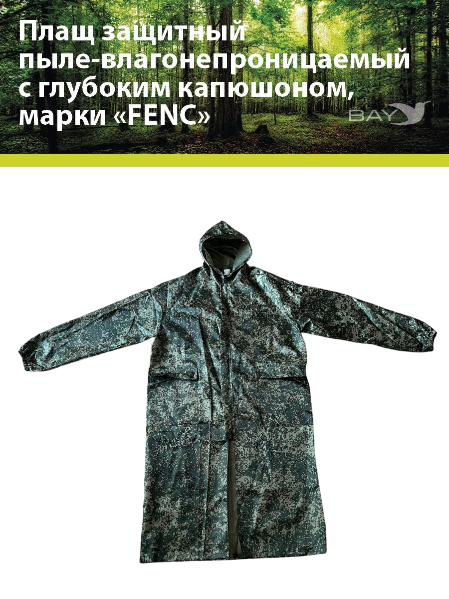 Плащ защитный, пыле-влагонепроницаемый с глубоким капюшоном, марки "FENC". Базовая модель. Глубокий капюшон с утяжкой шнурком на фиксаторах, с молнией, закрытой планкой, с накладными карманами на линии пояса по бокам.