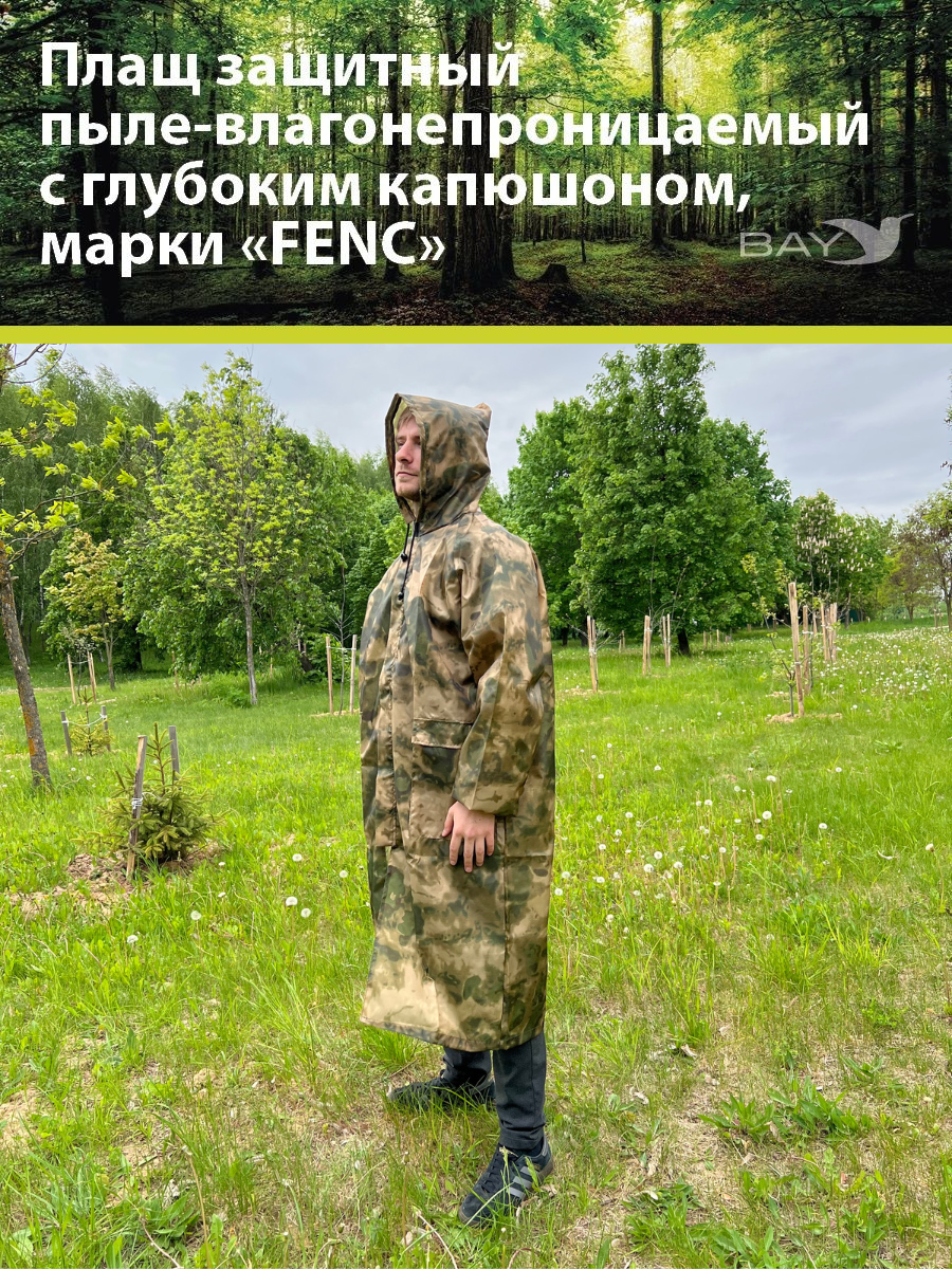 Плащ защитный, пыле-влагонепроницаемый с глубоким капюшоном, марки "FENC". Базовая модель. Глубокий капюшон с утяжкой шнурком на фиксаторах, с молнией, закрытой планкой, с накладными карманами на линии пояса по бокам. Возможно дооснащение дополнительными карманами на груди, защитные клапаны над карманами, установка кнопок на планке и клапанах, проклейка (герметизация) швов. Свободный крой.
