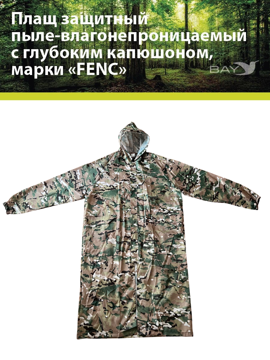 Плащ защитный, пыле-влагонепроницаемый с глубоким капюшоном, марки "FENC". Базовая модель. Глубокий капюшон с утяжкой шнурком на фиксаторах, с молнией, закрытой планкой, с накладными карманами на линии пояса по бокам. Возможно дооснащение дополнительными карманами на груди, защитные клапаны над карманами, установка кнопок на планке и клапанах, проклейка (герметизация) швов. Свободный крой. Продукция собственного производства.