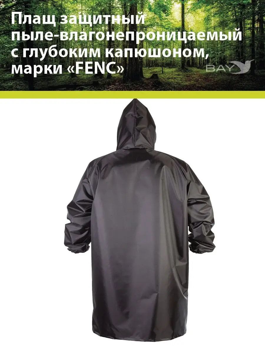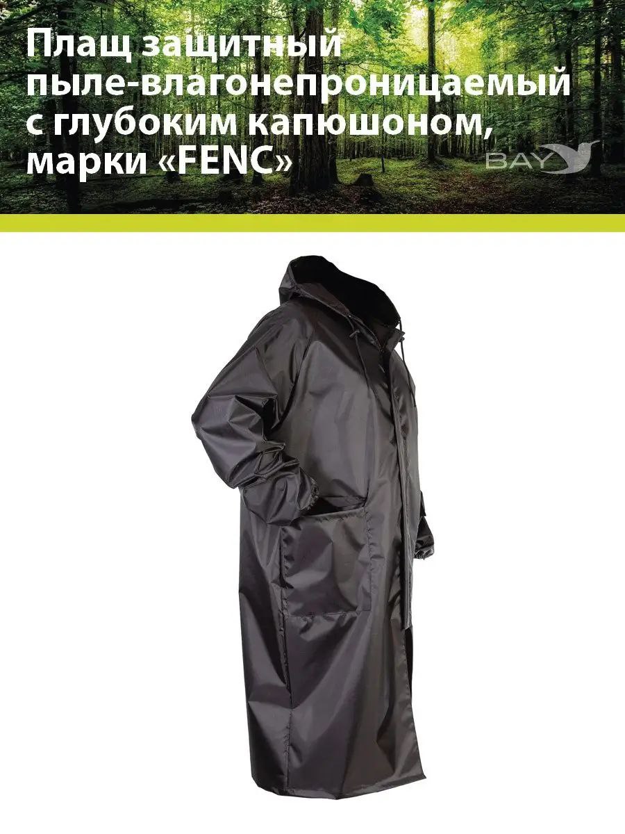 Плащ защитный, пыле-влагонепроницаемый с глубоким капюшоном, марки "FENC". Базовая модель: Глубокий капюшон с утяжкой шнурком на фиксаторах, с молнией, закрытой планкой, с накладными карманами на линии пояса по бокам. Возможно дооснащение дополнительными карманами на груди, защитные клапаны над карманами, установка кнопок на планке и клапанах, проклейка (герметизация) швов. Свободный крой.