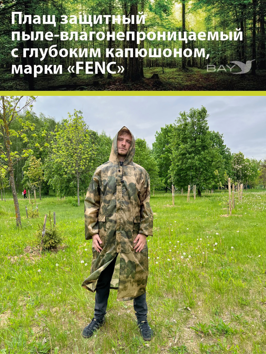 Плащ защитный, пыле-влагонепроницаемый с глубоким капюшоном, марки "FENC". Базовая модель. Глубокий капюшон с утяжкой шнурком на фиксаторах, с молнией, закрытой планкой, с накладными карманами на линии пояса по бокам. Возможно дооснащение дополнительными карманами на груди, защитные клапаны над карманами, установка кнопок на планке и клапанах, проклейка (герметизация) швов. Свободный крой.