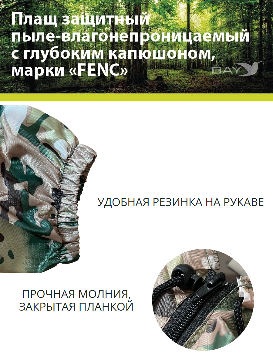 Плащ защитный, пыле-влагонепроницаемый с глубоким капюшоном, марки "FENC". Базовая модель. Глубокий капюшон с утяжкой шнурком на фиксаторах, с молнией, закрытой планкой, с накладными карманами на линии пояса по бокам. Возможно дооснащение дополнительными карманами на груди, защитные клапаны над карманами, установка кнопок на планке и клапанах, проклейка (герметизация) швов. Свободный крой. Продукция собственного производства.