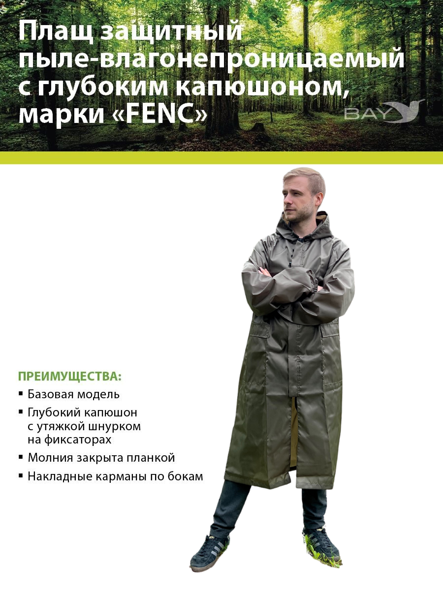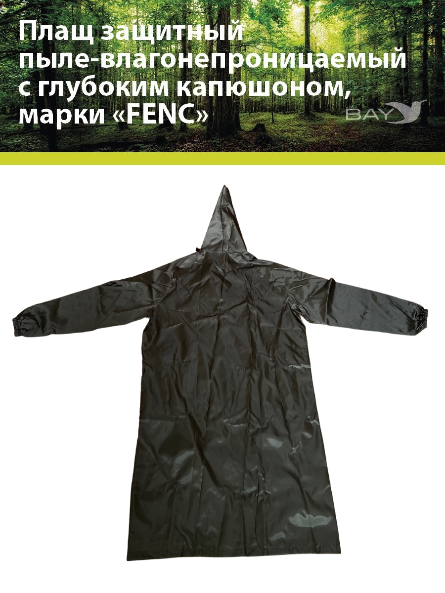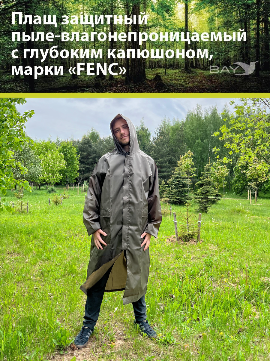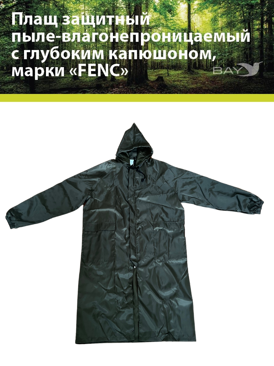 Плащ защитный, пыле-влагонепроницаемый с глубоким капюшоном, марки "FENC". Базовая модель. Глубокий капюшон с утяжкой шнурком на фиксаторах, с молнией, закрытой планкой, с накладными карманами на линии пояса по бокам. Возможно дооснащение дополнительными карманами на груди, защитные клапаны над карманами, установка кнопок на планке и клапанах, проклейка (герметизация) швов. Свободный крой. Продукция собственного производства.