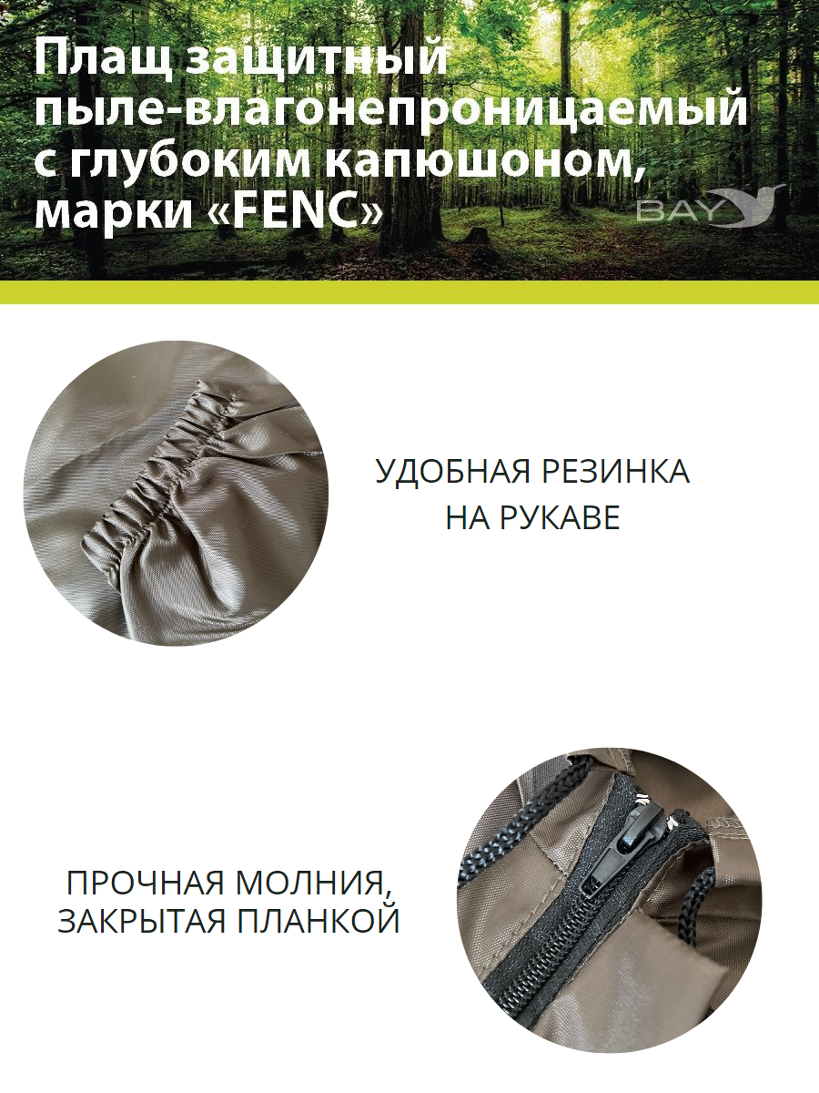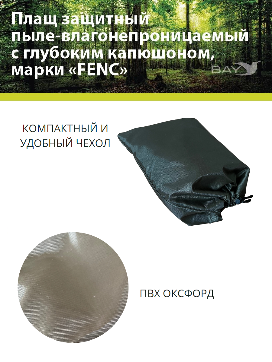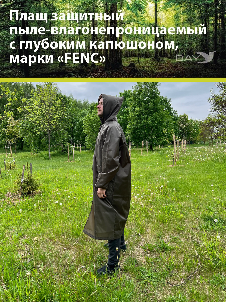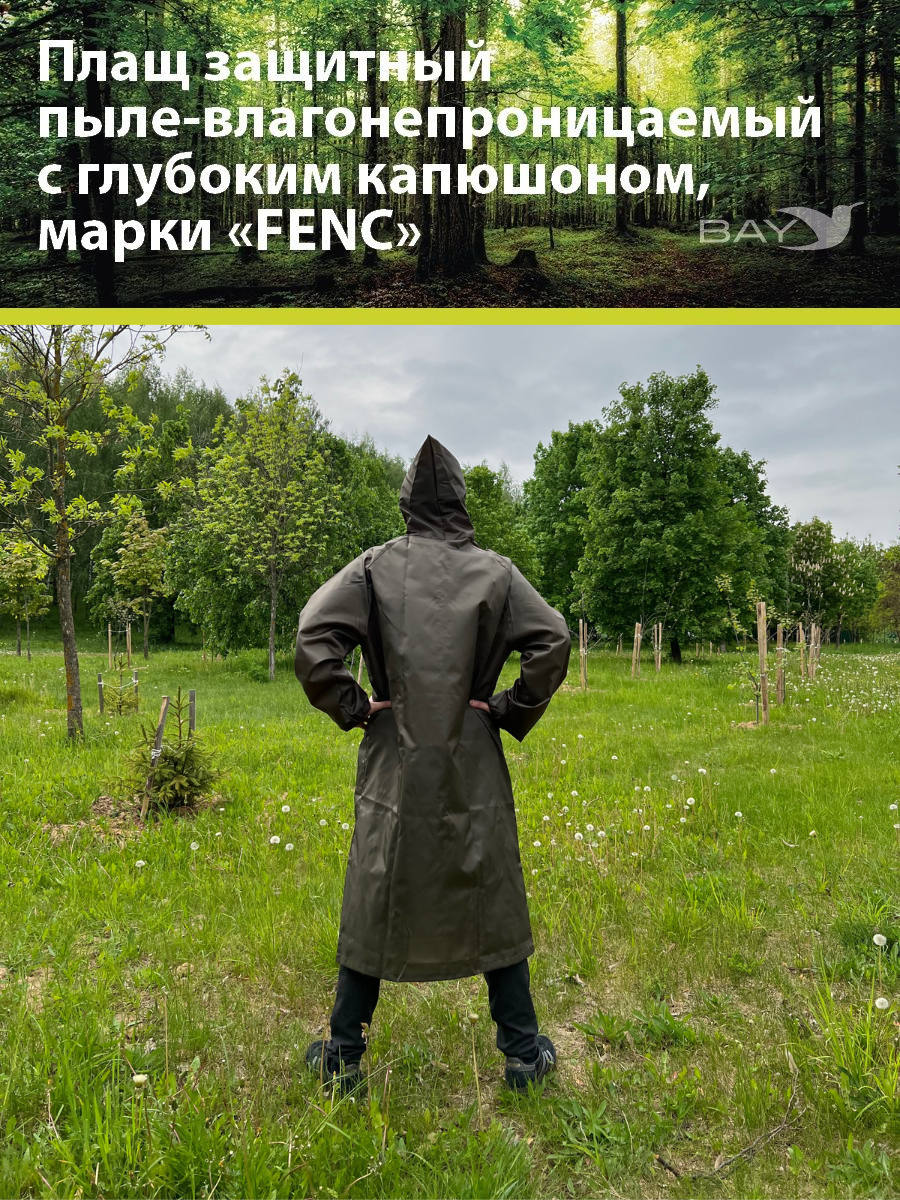 Плащ защитный, пыле-влагонепроницаемый с глубоким капюшоном, марки "FENC". Базовая модель. Глубокий капюшон с утяжкой шнурком на фиксаторах, с молнией, закрытой планкой, с накладными карманами на линии пояса по бокам. Возможно дооснащение дополнительными карманами на груди, защитные клапаны над карманами, установка кнопок на планке и клапанах, проклейка (герметизация) швов. Свободный крой. Продукция собственного производства.