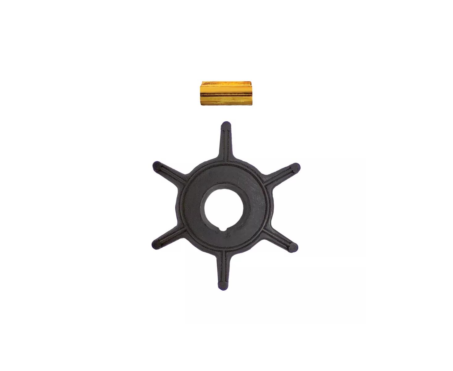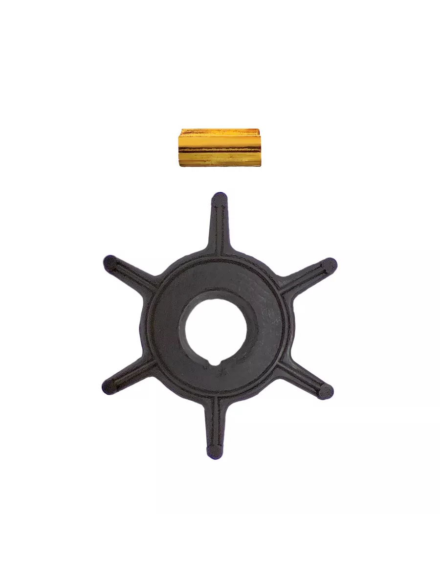Комплект крыльчатки водяной помпы с фигурной шпонкой для лодочных моторов мощностью 4-6 л.с. Устройство обеспечивает эффективную циркуляцию охлаждающей жидкости в системе двигателя.