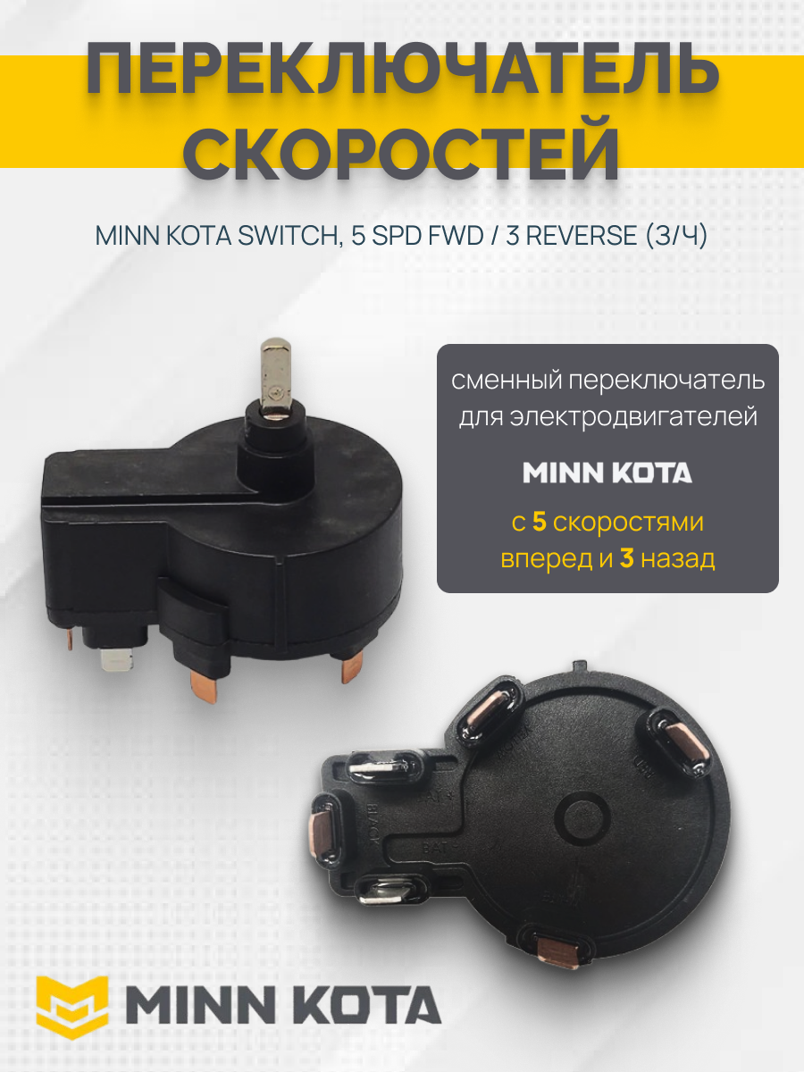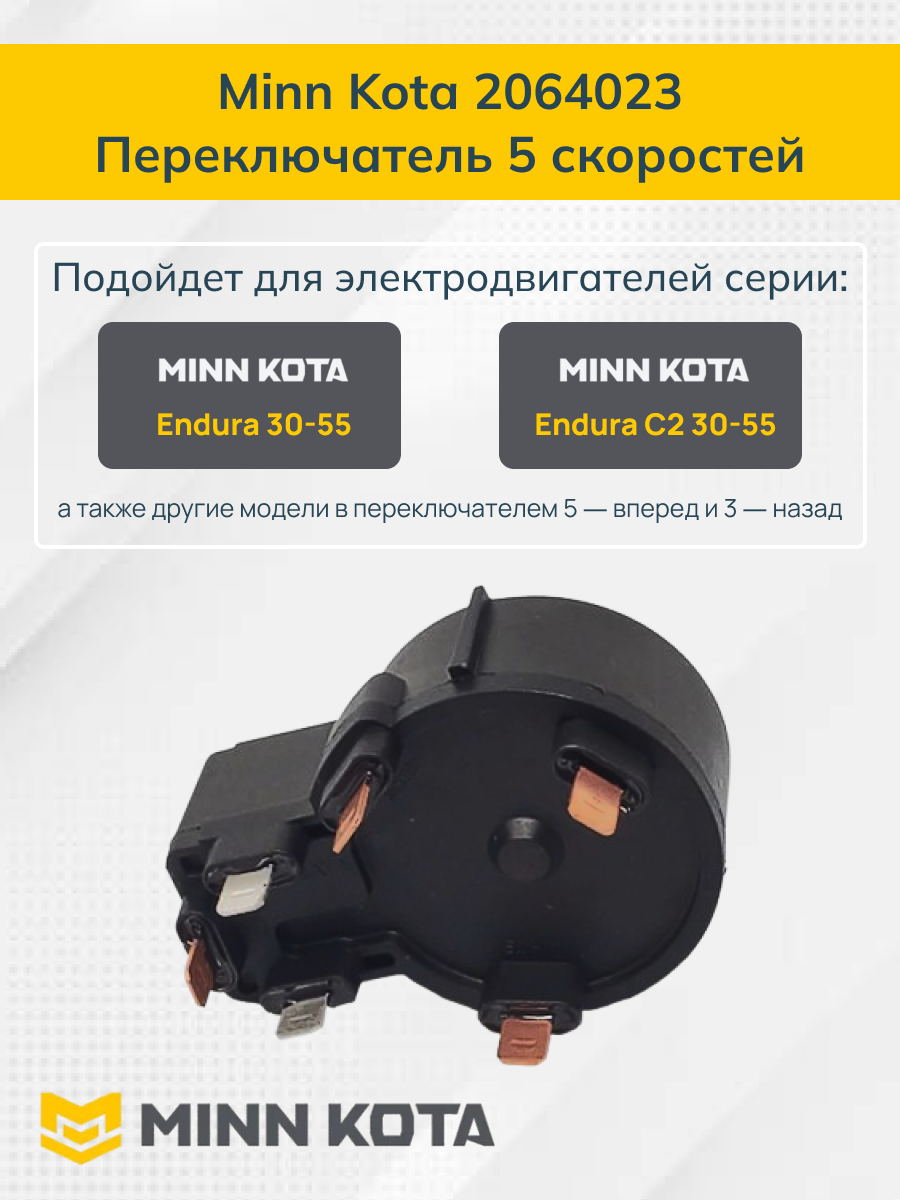 Minn Kota 2064023 Перекл. 5 скор. - подойдет для электродвигателей серии Minn Kota Endura 30-55, Minn Kota Endura С2 30-55, а также другие модели в переключателем 5 ― вперед и 3 ― назад.