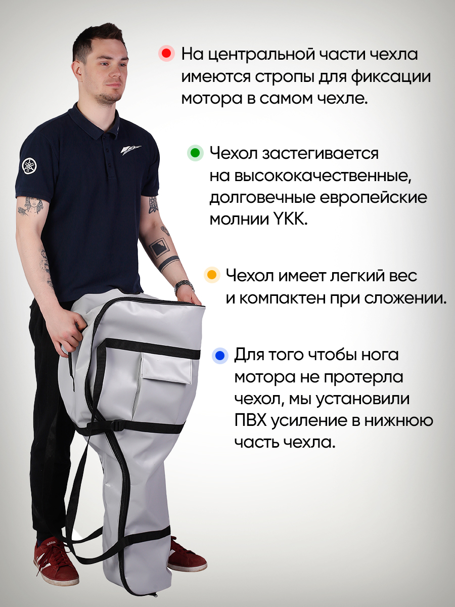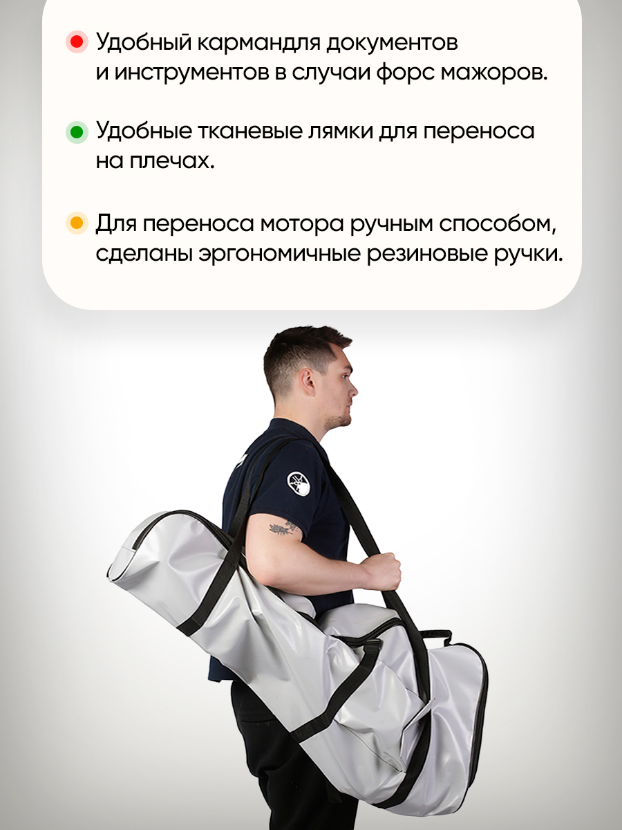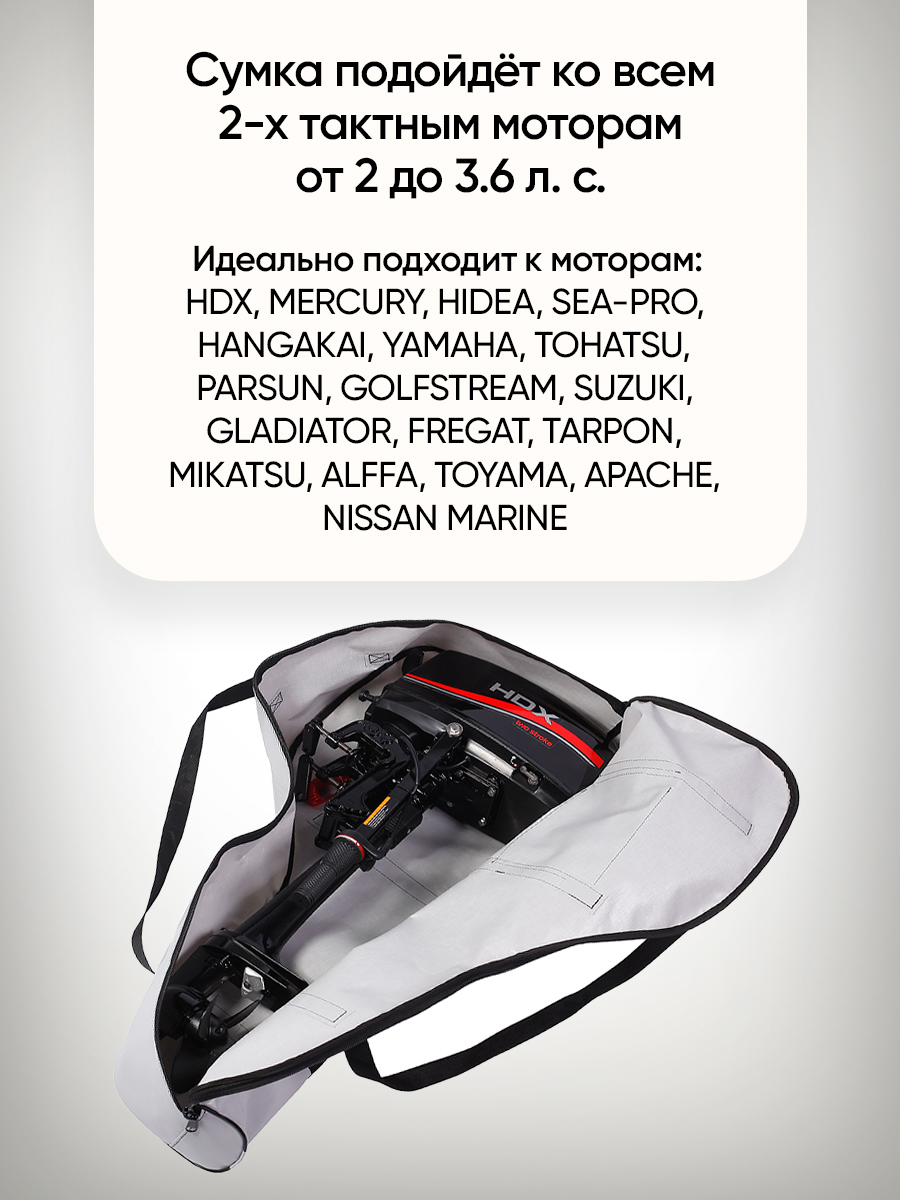 Представленный чехол подойдет для транспортировки и хранения моторов 2,0 - 3,5 л.с. большинства известных брендов: SEA-PRO, Hidea, HDX, Golfstream, Parsun, Toyama, Yamaha и др.