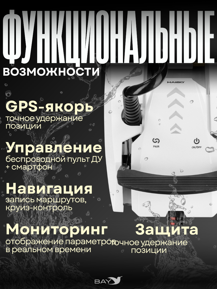 - Функции: GPS-якорь, круиз-контроль, навигация, запись маршрутов