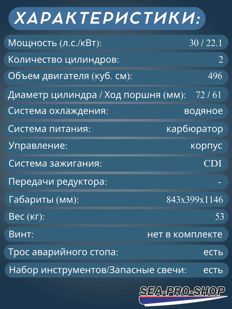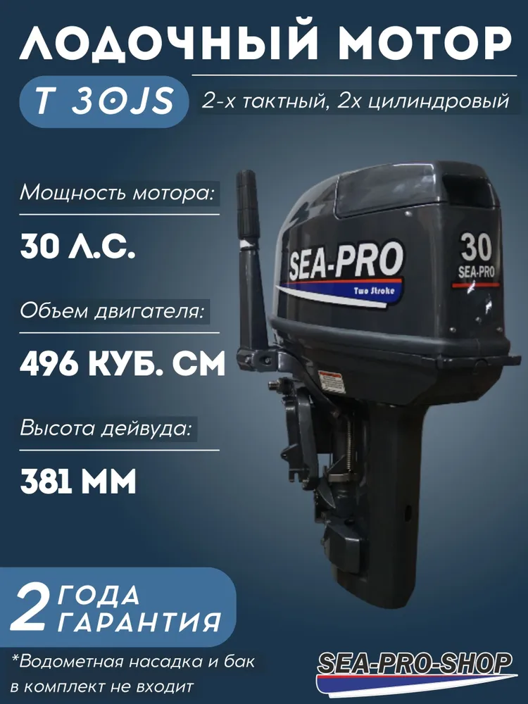 Двухтактный лодочный мотор Sea-Pro T30JS представляет собой 2-х цилиндровую модель мощностью 30 л.с., зарекомендовавшую себя как надежная. Эта модель комплектуется водометной насадкой Sea-Pro T30 вместо редуктора. Sea-Pro T30S Jet имеет объем двигателя 496 см³ и весит 56 кг. Максимальные обороты находятся в диапазоне от 4500 до 5500. Запуск двигателя осуществляется с помощью ручного стартера. Мотор также имеет румпельное управление (ручка газа на румпеле) и предназначен для стандартной высоты транца 381 мм. В комплект не входит топливный бак.