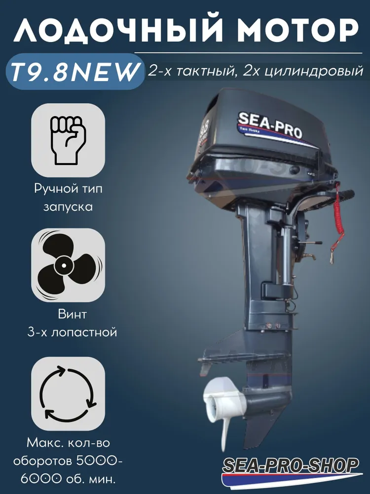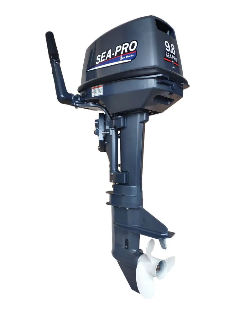 Sea-Pro T 9.8 S new оснащен румпельным управлением, что позволяет удобно регулировать газ с помощью ручки на румпеле. Запуск двигателя осуществляется вручную с помощью шнура. Мотор имеет три передачи: переднюю, нейтраль и заднюю, а также режим для передвижения по мелководью. Он предназначен для стандартной высоты транца 381 мм и комплектуется внешним топливным баком объемом 12 литров.