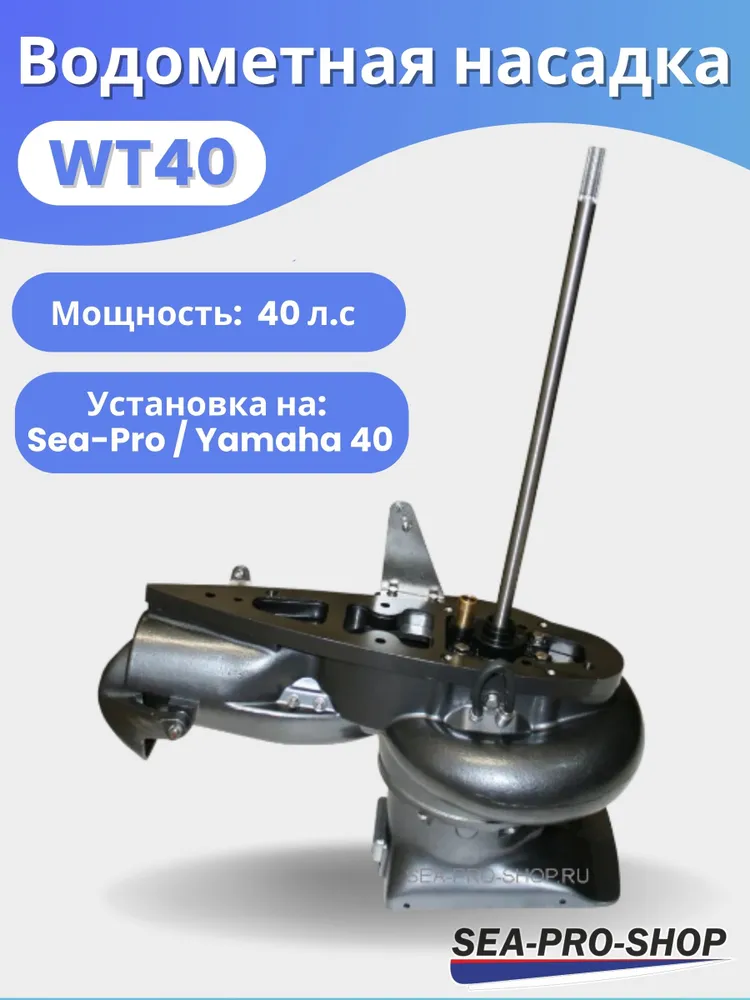 Водометная насадка SEA-PRO WT40 предназначена для подвесных лодочных моторов мощностью 40 л.с. Она представляет собой альтернативу традиционному гребному винту и функционирует по принципу центробежного насоса. В процессе вращения лопастей импеллера вода поступает в корпус с носовой стороны и выталкивается в противоположном направлении, что обеспечивает движение судна.